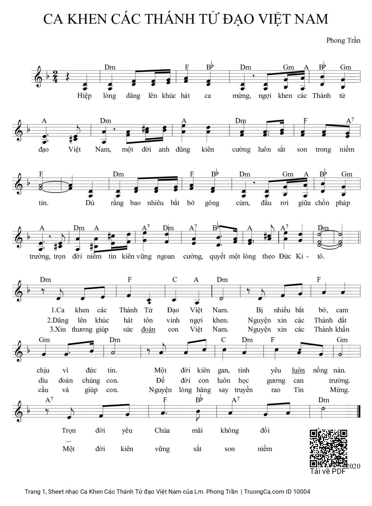 Điệp khúc. Hiệp lòng dâng lên khúc hát ca mừng ngợi khen các Thánh tử đạo Việt Nam, một đời anh dũng kiên cường luôn sắt son trong niềm tin dù rằng bao nhiêu bắt bớ gông cùm đầu rơi giữa chốn pháp trường. Trọn đời niềm tin kiên vững ngoan cườngquyết một lòng theo Đức Ki-Tô