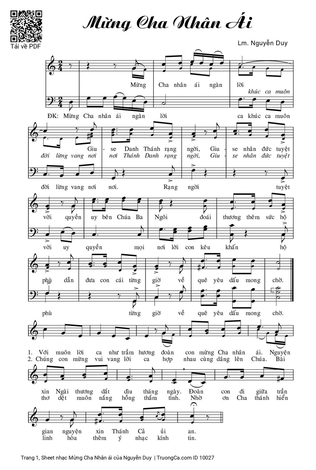 Điệp khúc: Mừng Cha nhân ái ngàn lời (Khúc ca muôn đời) Giu-se Danh Thánh rạng ngời, Giu-se nhân đức tuyệt vời quyền uy bên Chúa Ba Ngôi đoái thương thêm sức hộ phù dẫn đưa con cái từng giờ về quê yêu dấu mong chờ.