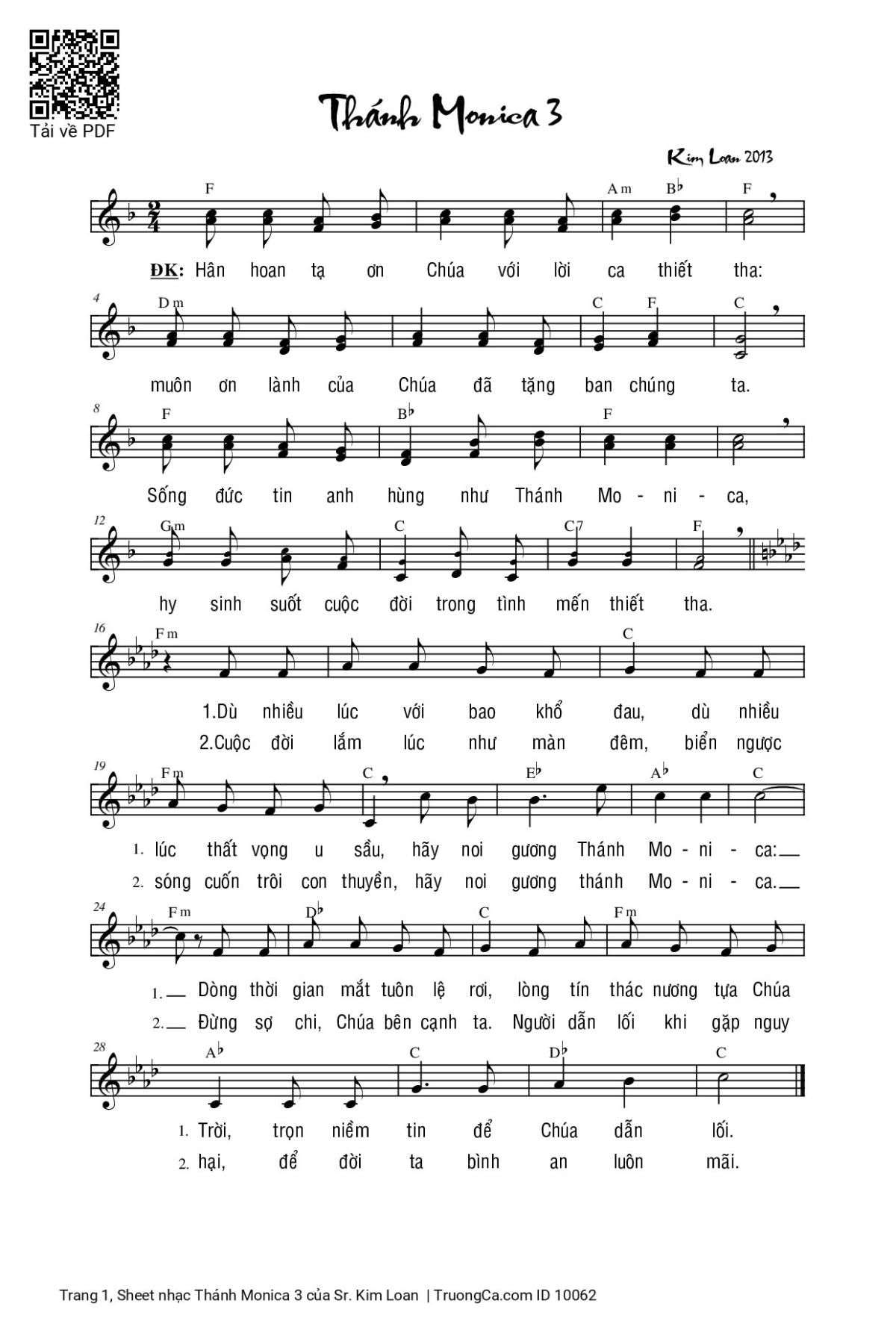 Transposition is the process of moving a song's melody and chords up or down in pitch by a constant interval. The direction of the transposition tool is indicated by a plus (+) sign for up and a minus (-) sign for down. Hover mouse over chords signs to see the chords chart of Thánh Monica 3 song.