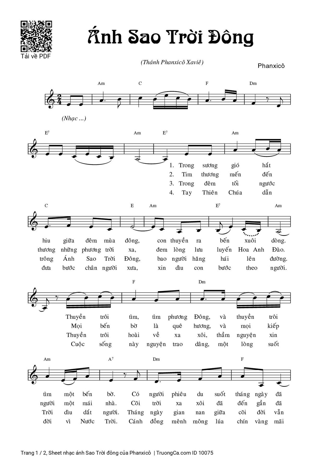 Transposition is the process of moving a song's melody and chords up or down in pitch by a constant interval. The direction of the transposition tool is indicated by a plus (+) sign for up and a minus (-) sign for down. Hover mouse over chords signs to see the chords chart of ánh Sao Trời đông song.