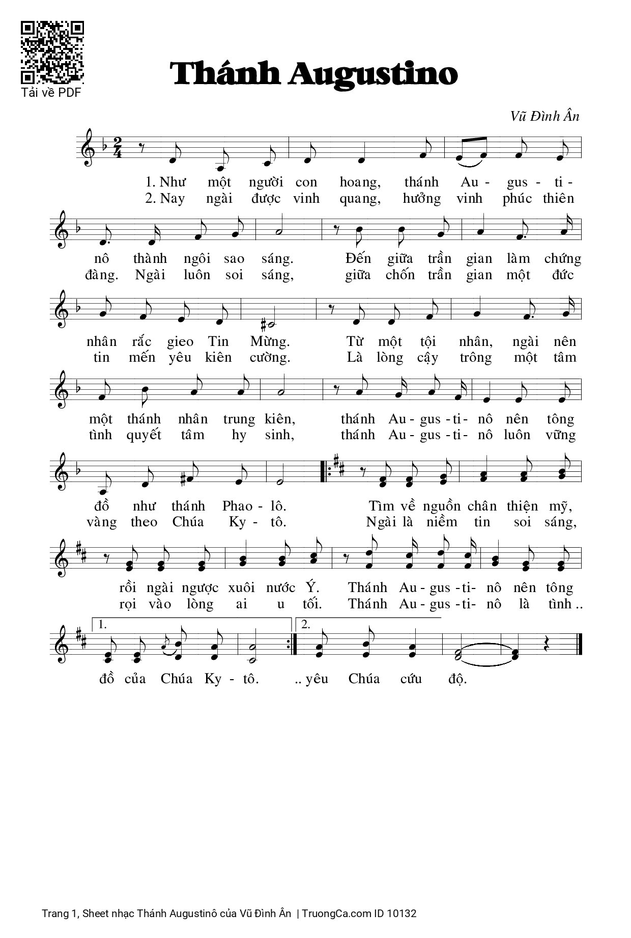Điệp khúc: Tìm về nguồn chân thiện mỹ, rồi ngài ngược xuôi nước Ý, thánh Augustinô nên tông đồ của Chúa Kitô. Ngài là niềm tin soi sáng rọi vào lòng ai u tối, thánh Augustinô là tình yêu Chúa cứu độ