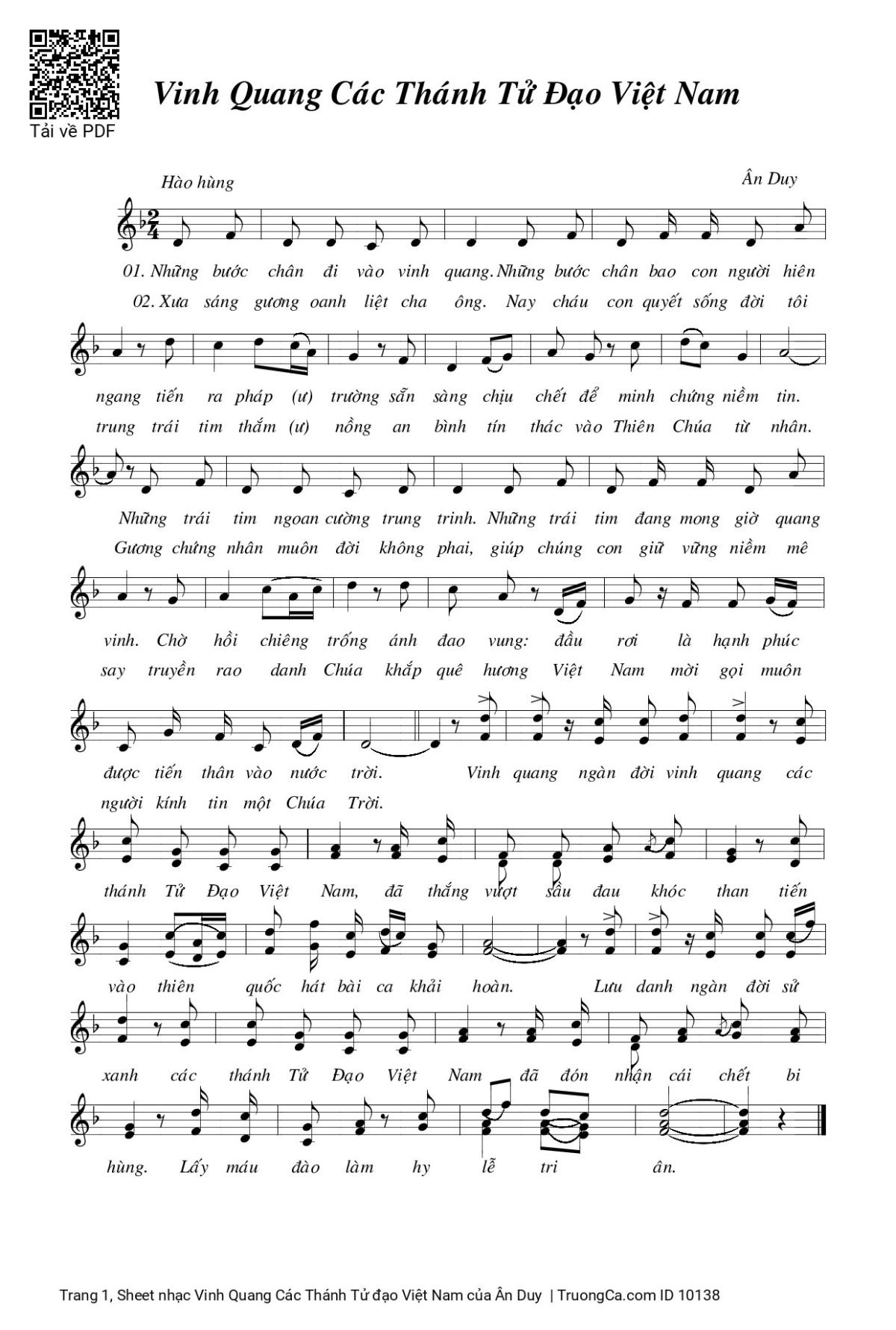 Điệp khúc. Vinh quang ngàn đời vinh quang Các Thánh Tử đạo Việt Nam, đã thắng vượt sầu đau khóc than tiến vào thiên quốc hát bài ca khải hoàn. Lưu danh ngàn đời sử xanh Các Thánh Tử đạo Việt Nam đã đón nhận cái chết bi hùng. Lấy máu đào làm hy lễ tri ân.