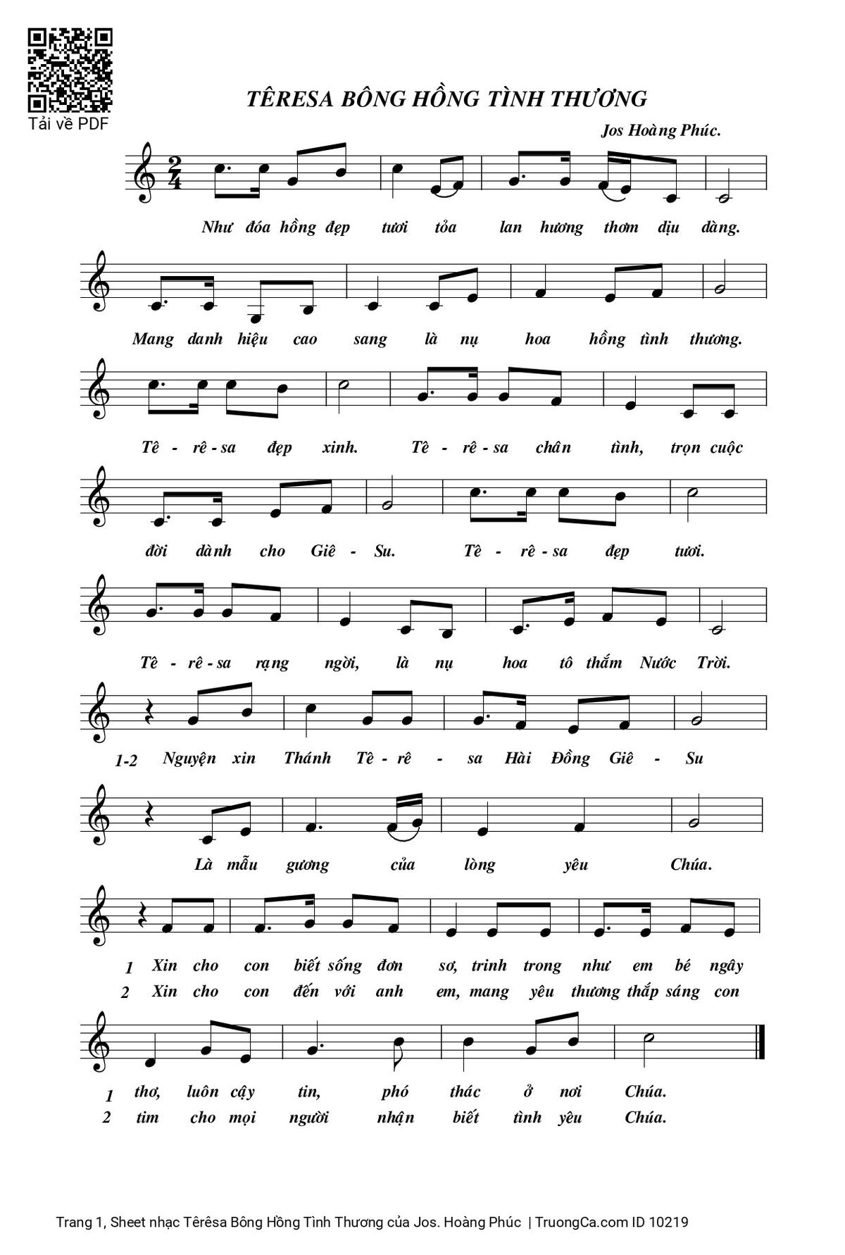 Điệp khúc. Như đóa hồng đẹp tươi tỏa lan hương thơm dịu dàng, mang danh hiệu cao sang là nụ hoa hồng tình thương. Têrêsa đẹp xinh Têrêsa chân tình trọn cuộc đời dành cho Giêsu. Têrêsa đẹp tươi Têrêsa rạng ngời là nụ hoa tươi thắm Nước Trời