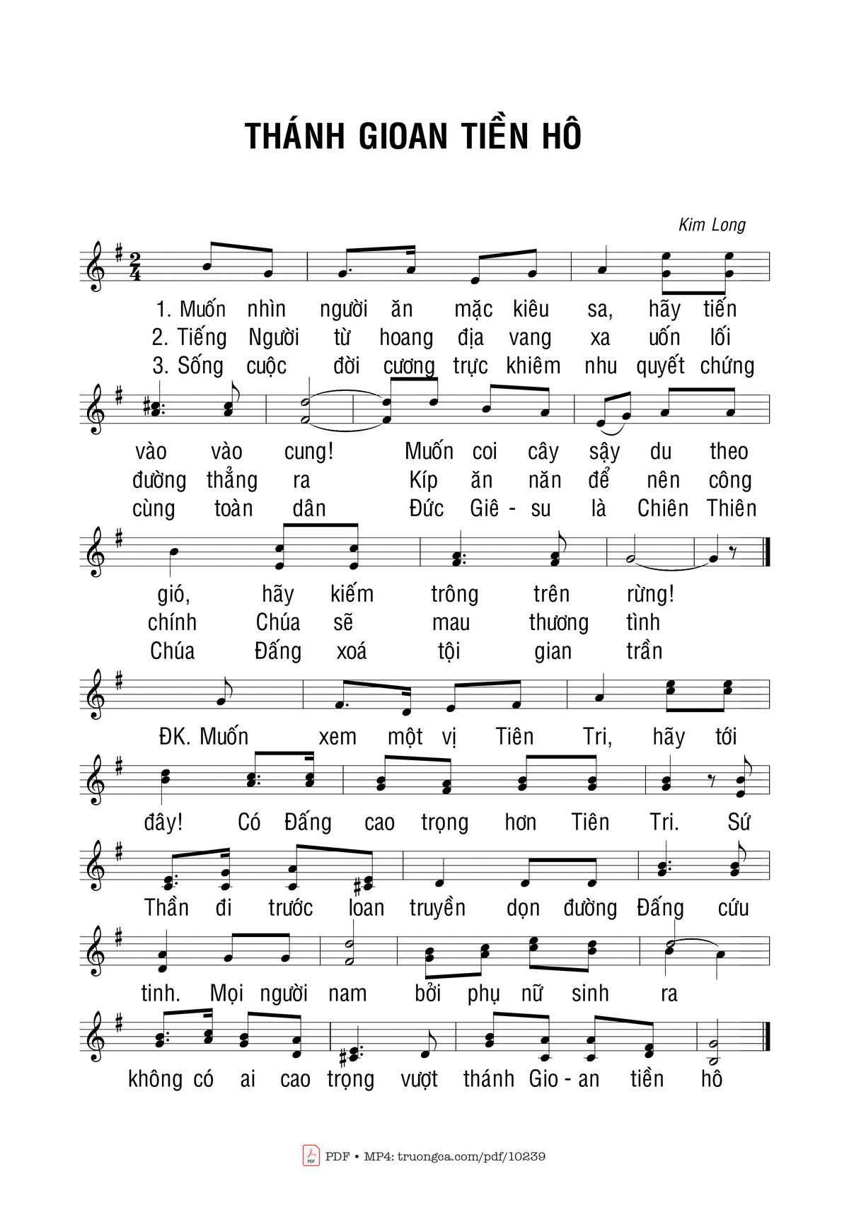 Điệp khúc. Muốn xem một vị tiên tri hãy tới đây có Đấng cao trọng hơn tiên tri. Sứ thần đi trước loan truyền dọn đường Đấng cứu tinh. Mọi người nam bởi người nữ sinh ra không có ai cao trọng vượt thánh Gioan tiền hô