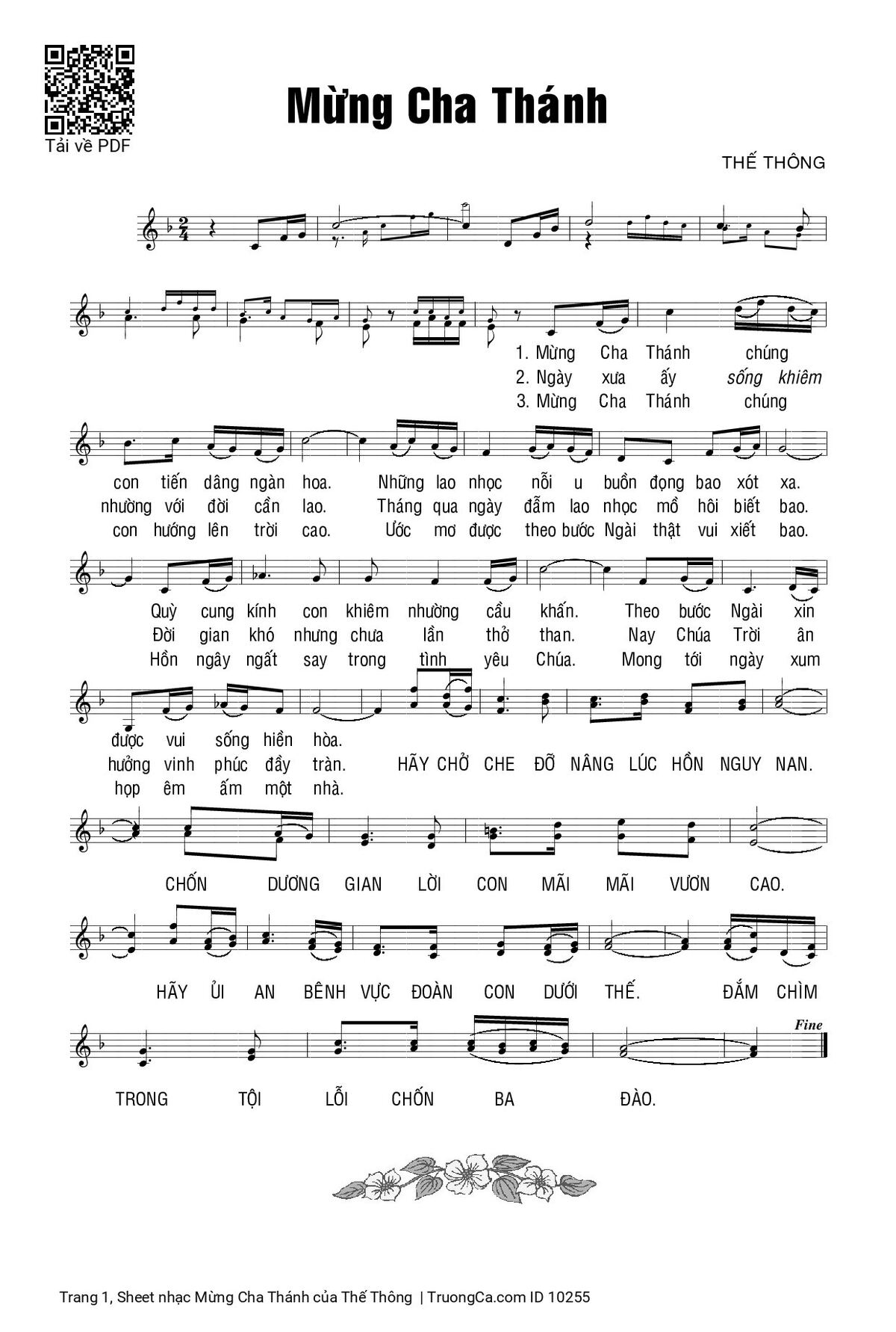 1. Mừng Cha Thánh chúng con dâng lên ngàn hoa (dâng tiến ngàn hoa). Những lao nhọc nỗi u buồn đượm bao đắng cay (Ngàn muôn đắng cay). Lòng cung kính con dâng lời cầu khấn (dâng lên cầu khấn). Thương đáp tình xin được vinh phúc cùng Người.