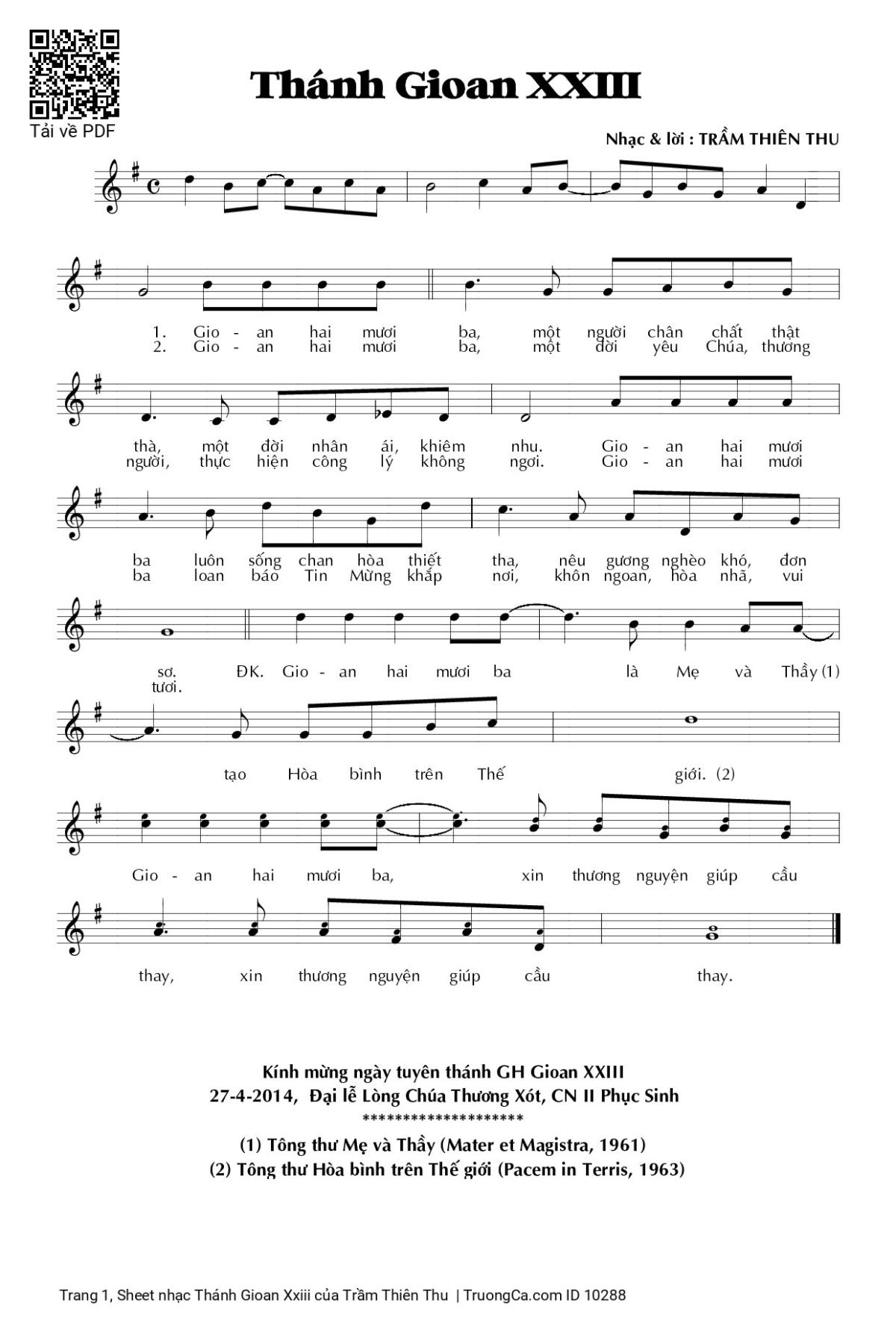 Điệp khúc. Gioan hai mươi ba là mẹ và thầy, tạo hòa bình trên thế giới. Gioan hai mươi ba xin thương nguyện giúp cầu thay, xin thương nguyện giúp cầu thay