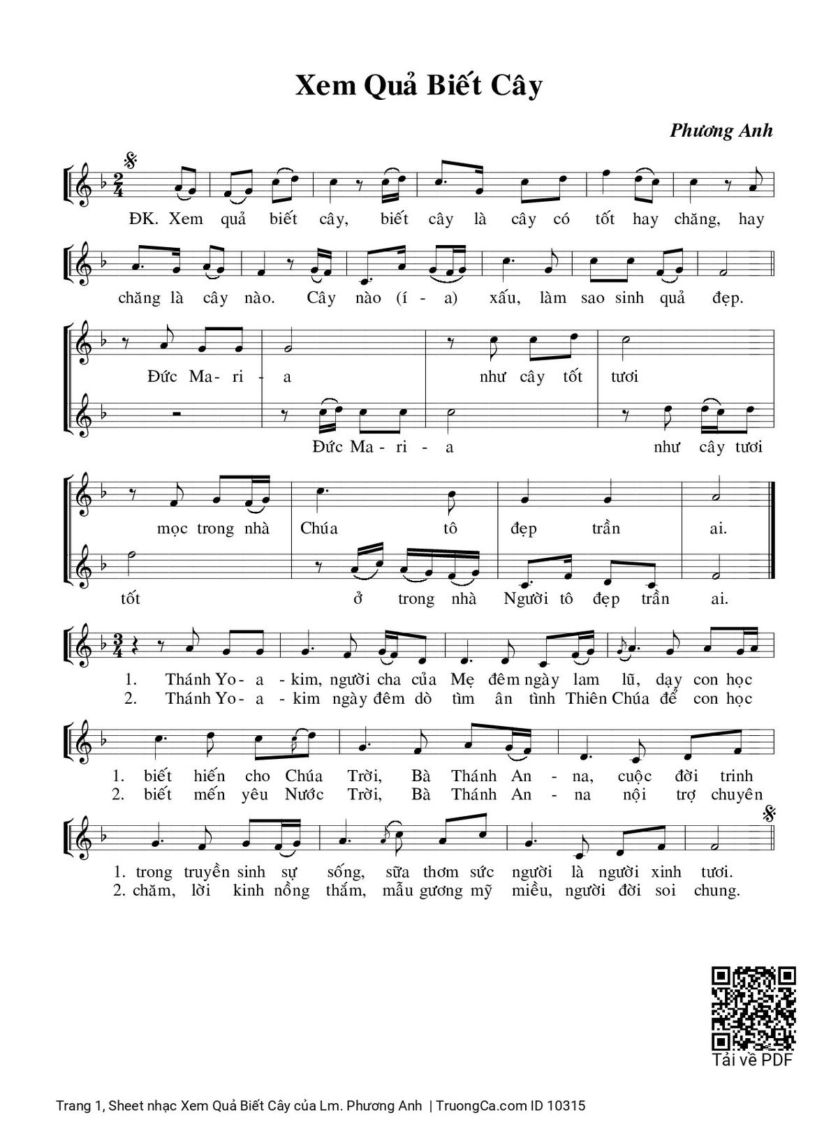 Điệp khúc. Xem quả biết cây, biết cây là cây có tốt hay chăng, hay chăng là cây nào, cây nào (í a) xấu, làm sao sinh quả đẹp. Đức Ma-ri-a như cây tốt tươi, mọc trong nhà Chúa tô đẹp trần ai.