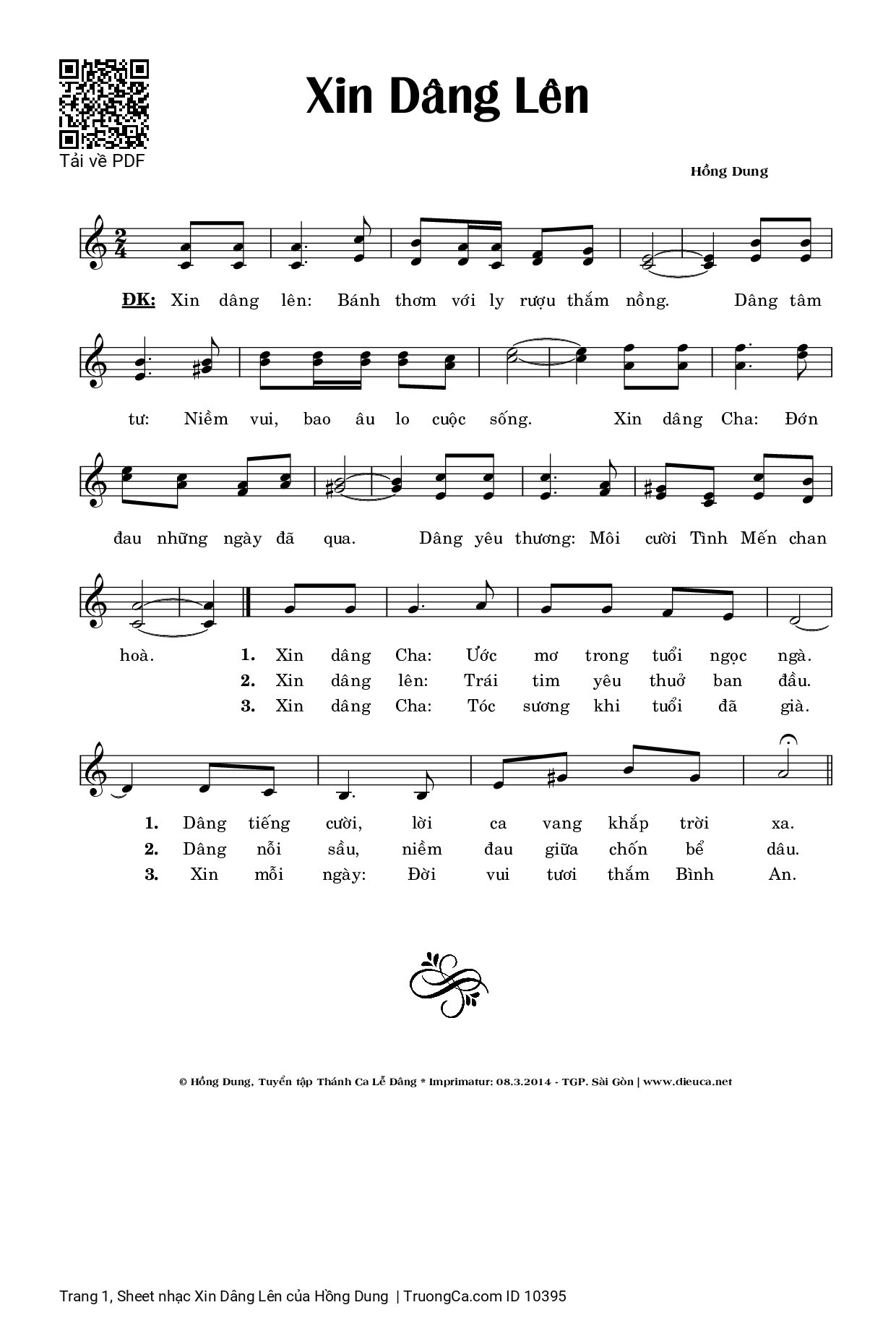Điệp khúc: Xin dâng lên: Bánh thơm với ly rượu thắm nồng. Dâng tâm tư: Niềm vui, bao âu lo cuộc sống. Xin dâng Cha: Đớn đau những ngày đã qua. Dâng yêu thương: Môi cười Tình Mến chan hoà.