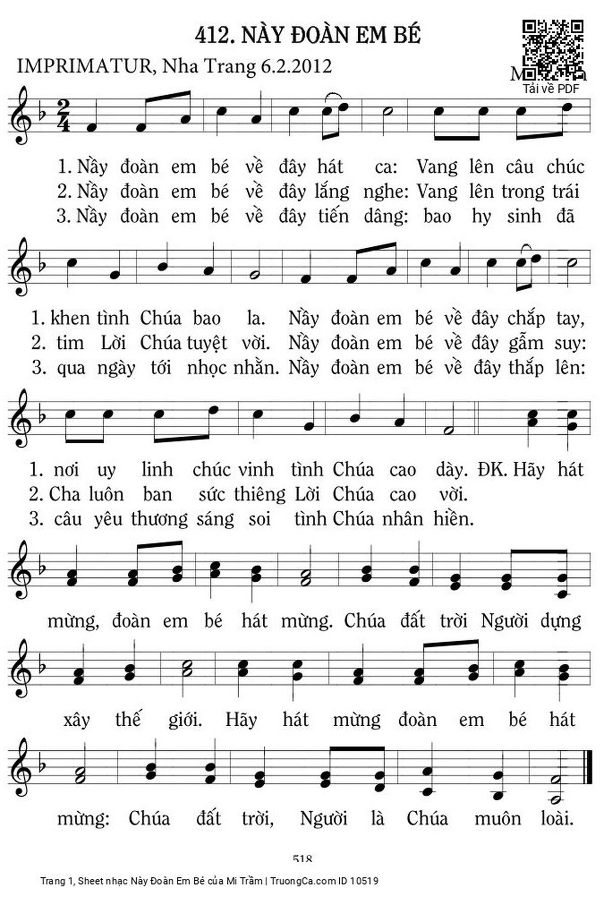 Mi Trầm Này đoàn em bé về đây hát ca Vang lên câu chúc khen tình Chúa bao la [PDF] [Sheet] [Lyrics] [Mp4/Midi]