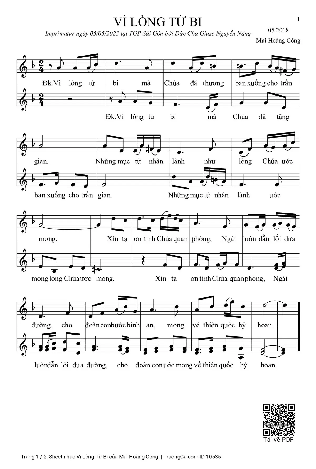 Điệp khúc. Vì lòng từ bi, mà Chúa đã thương ban xuống cho trần gian, những mục tử nhân lành như lòng Chúa ước mong. Xin tạ ơn tình Chúa quan phòng, Ngài luôn dẫn lối đưa đường, cho đoàn con bước bình an, mong về thiên quốc hỷ hoan.