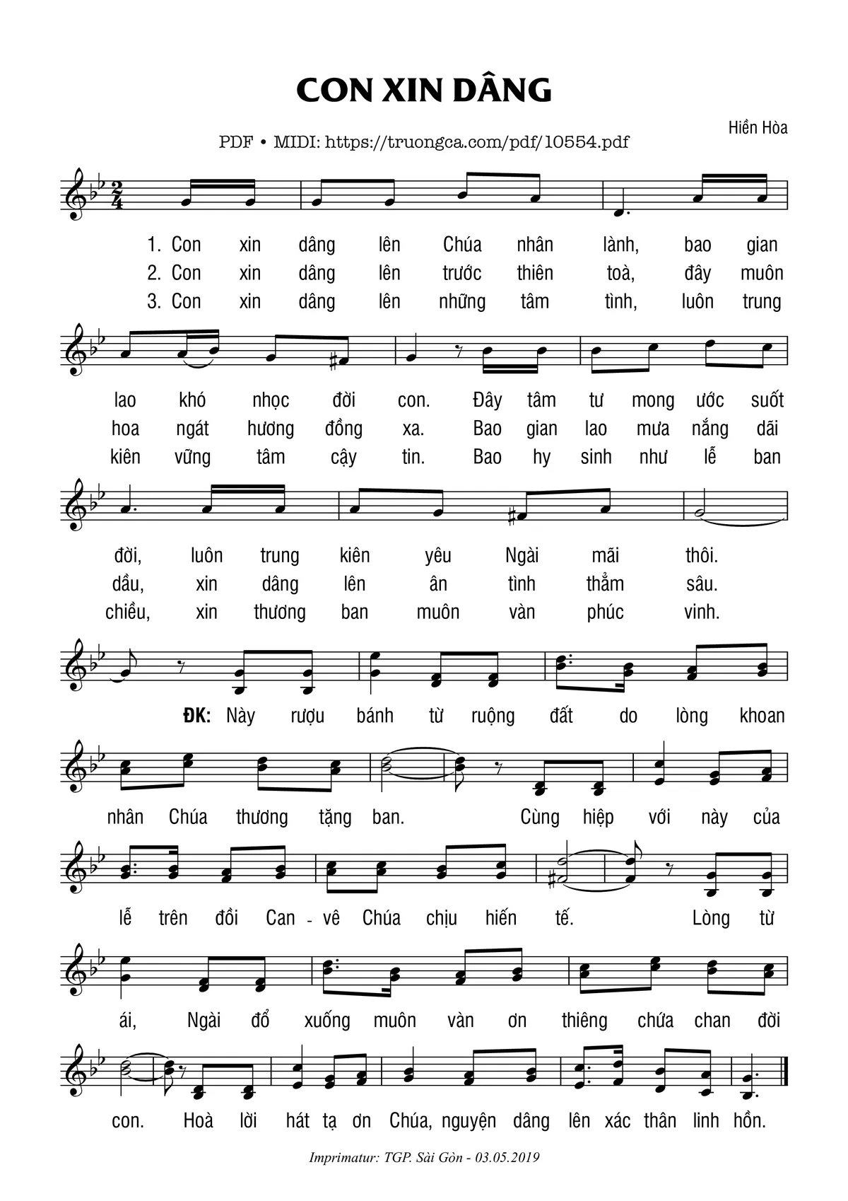 1. Con xin dâng lên Chúa nhân lành, bao gian lao khó nhọc đời con. Đây tâm tư mong ước suốt đời, luôn trung kiên yêu Ngài mãi thôi.
