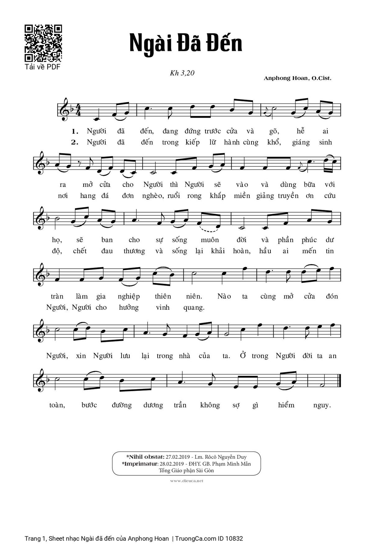 1. Người đã đến, đang đứng trước cửa và gõ, hễ ai ra mở cửa cho Người thì Người sẽ vào và dùng bữa với họ, sẽ ban cho sự sống muôn đời và phần phúc dư tràn làm gia nghiệp thiên niên. Nào ta cùng mở cửa đón Người, xin Người lưu lại trong nhà của ta. Ở trong Người đời ta an toàn, bước đường dương trần không sợ gì hiểm nguy.