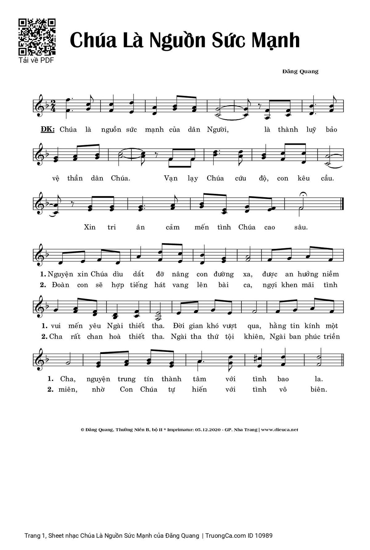 Điệp khúc: Chúa là nguồn sức mạnh của dân Người, là thành luỹ bảo vệ thần dân Chúa. Vạn lạy Chúa cứu độ, con kêu cầu. Xin tri ân cảm mến tình Chúa cao sâu.