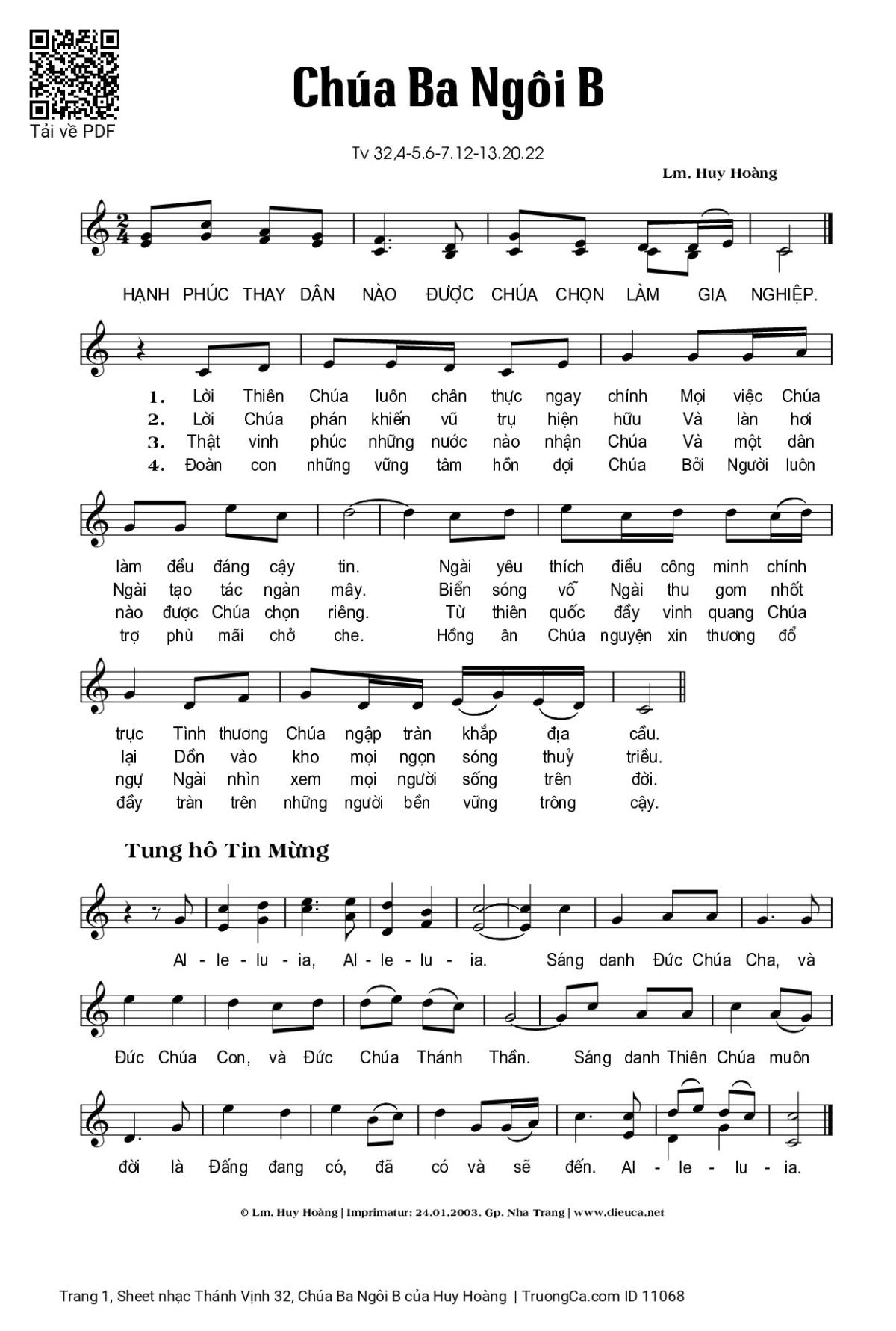 The Videos/audios Thánh Vịnh 32, Chúa Ba Ngôi B by Huy Hoàng were embed from Youtube, Musescore or the other 3rd links. Videos are subject to 3rd's copyright control and may be removed by YouTube's copyright rules and 3rd's policies or maybe included advertisements. If you cannot access to these songs, this mean that have been removed.