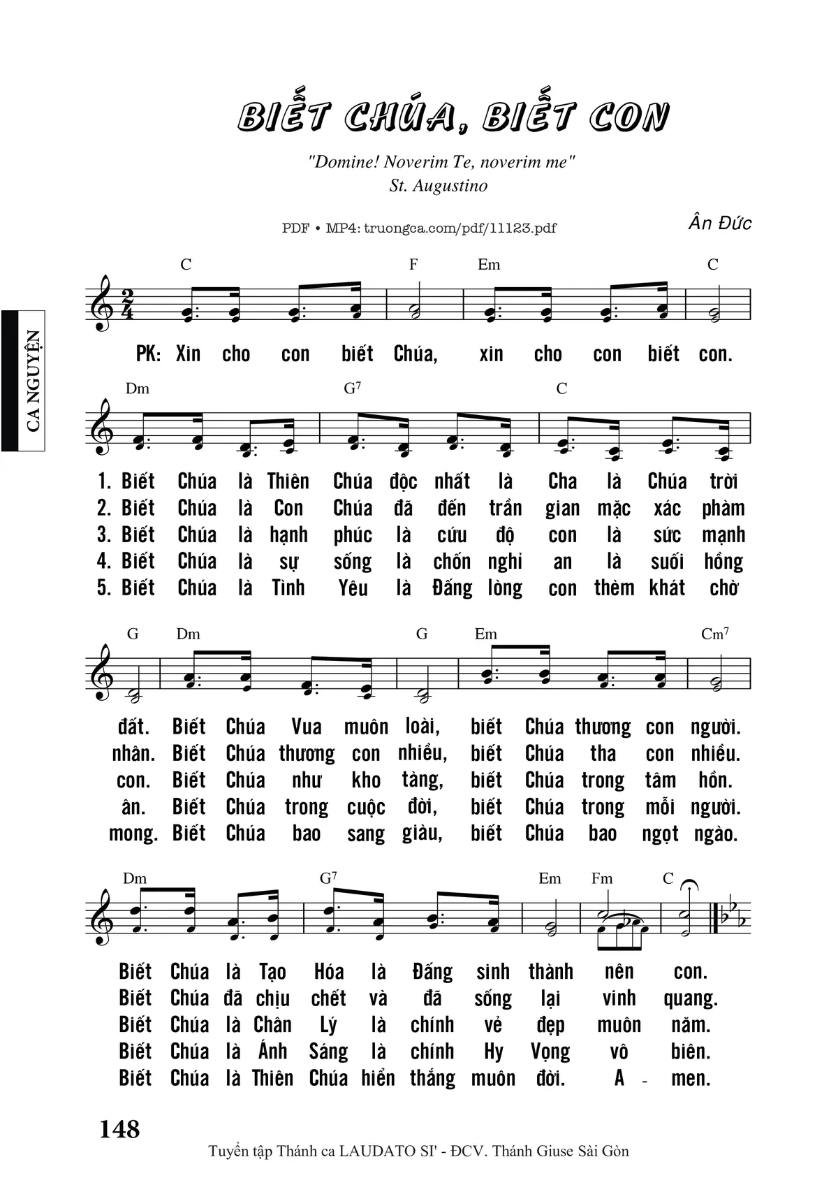 4. Xin cho con biết Chúa, xin cho con biết con. Biết Chúa là sự sống là chốn nghỉ an là suối hồng ân. Biết Chúa trong cuộc đời, biết Chúa trong mọi người, biết Chúa là ánh sáng, là chính hy vọng vô biên. Biết con khi lạc đường được Ngài dẫn lối đưa về. Biết con bao lần rồi, để lòng chai đá ngủ mê. Biết con hư đời đời, được Ngài thương tình cứu vớt. Biết con quên tình Ngài, mà Ngài chung tín không ngơi. Xin cho con biết Chúa, xin cho con biết con. Biết Chúa là tình yêu, là đấng lòng con thèm khát chờ mong. Biết Chúa bao sang giàu, biết Chúa bao ngọt ngào. Biết Chúa là Thiên Chúa hiển thông muôn đời. Amen.