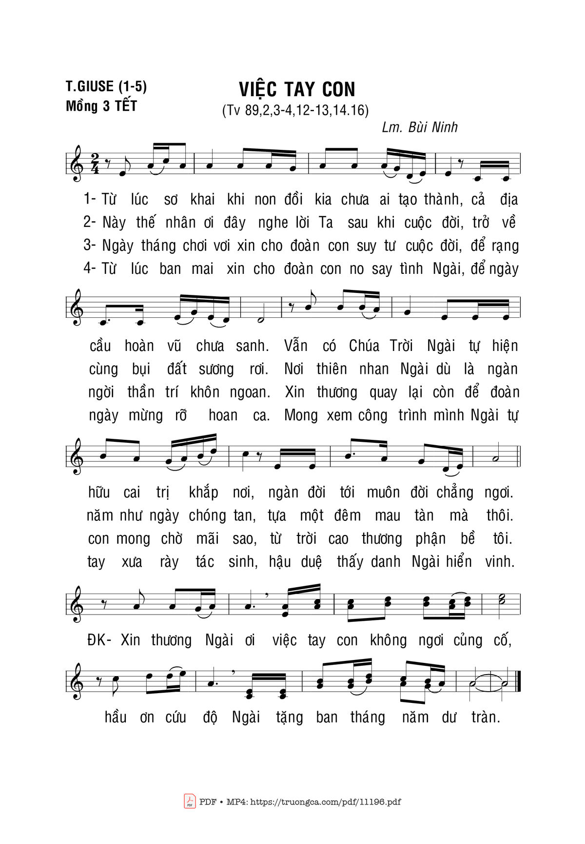 The Videos/audios Thánh Vịnh 89, Việc Tay Con (Bùi Ninh) by Bùi Ninh were embed from Youtube, Musescore or the other 3rd links. Videos are subject to 3rd's copyright control and may be removed by YouTube's copyright rules and 3rd's policies or maybe included advertisements. If you cannot access to these songs, this mean that have been removed.