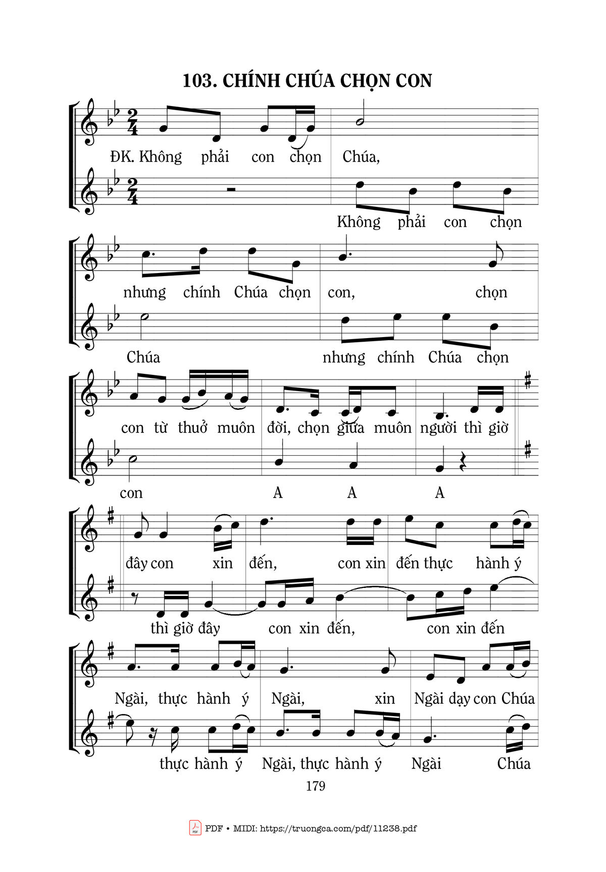 Điệp khúc. Không phải con chọn Chúa, nhưng chính Chúa chọn con, chọn con từ thuở muôn đời, chọn giữa muôn người thì giờ đây con xin đến, con xin đến thực hành ý Ngài, thực hành ý Ngài, xin Ngài dạy con Chúa ơi, xin Ngài dạy con Chúa ơi.