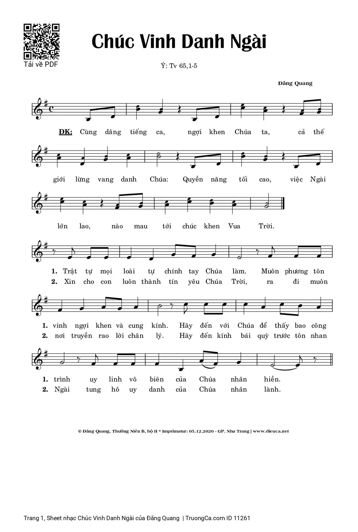 Điệp khúc: Cùng dâng tiếng ca, ngợi khen Chúa ta, cả thế giới lừng vang danh Chúa: Quyền năng tối cao, việc Ngài lớn lao, nào mau tới chúc khen Vua Trời.
