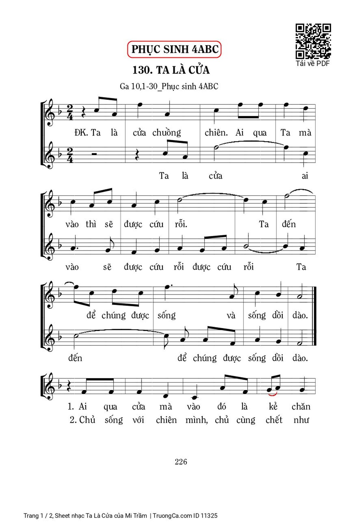 Điệp khúc. Ta là cửa chuồng chiên. Ai qua Ta mà vào thì sẽ được cứu rỗi. Ta đến để chúng được sống và sống dồi dào.
