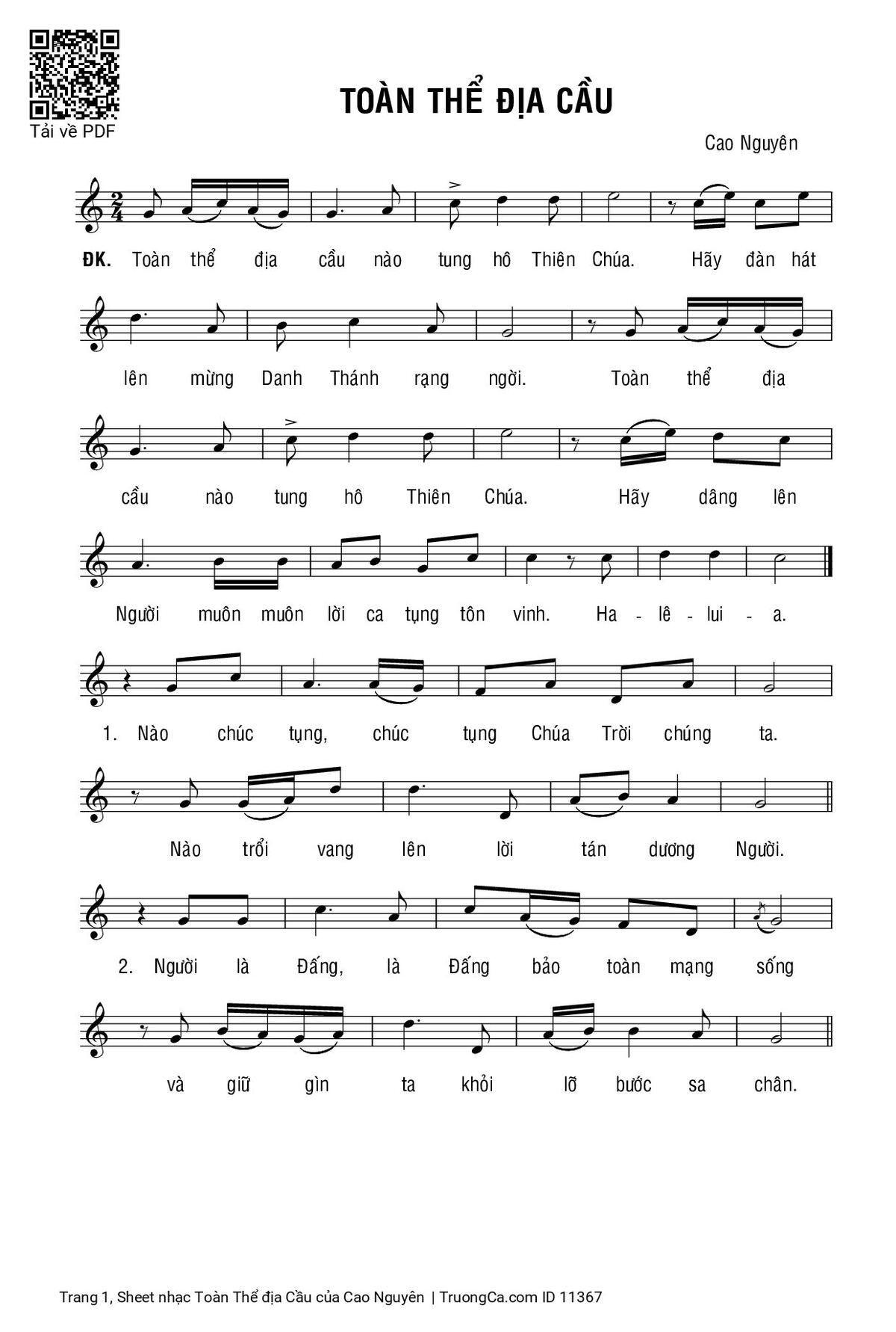 Điệp khúc. Toàn thể địa cầu nào tung hô Thiên Chúa. Hãy đàn hát lên mừng Danh Thánh rạng ngời. Toàn thể địa cầu nào tung hô Thiên Chúa. Hãy dâng lên Người muôn muôn lời ca tụng tôn vinh. Ha-lê-lui-a.