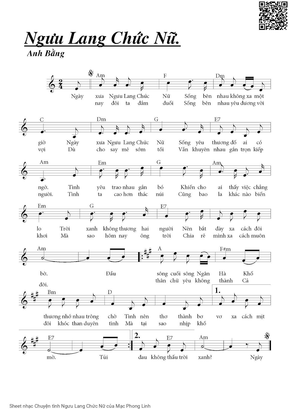 Mạc Phong Linh Ngày xưa Ngưu Lang Chức Nữ Sống bên nhau không xa một giờ [PDF] [Sheet] [Lyrics] [Story and comment]