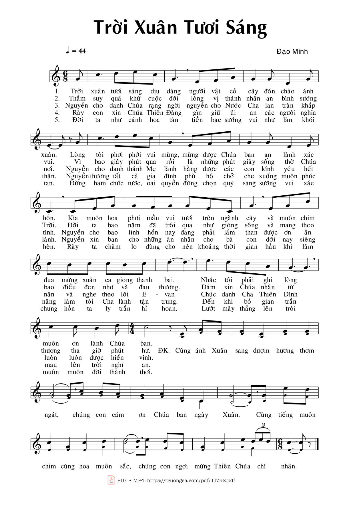 Điệp khúc. Cùng ánh Xuân sang, đượm hương thơm ngát chúng con cám ơn Chúa ban ngày Xuân. Cùng tiếng muôn chim, cùng hoa muôn sắc, chúng con ngợi mừng Thiên Chúa chí nhân.