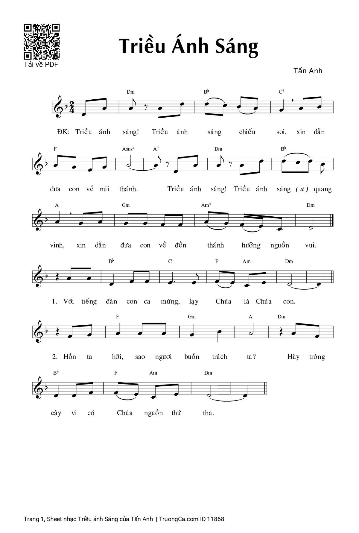 Điệp khúc. Triều ánh sáng! Triều ánh sáng chiếu soi, xin dẫn đưa con về núi thánh. Triều ánh sáng! Triều ánh sáng (ư) quang vinh, xin dẫn đưa con về đền thánh hưởng nguồn vui.