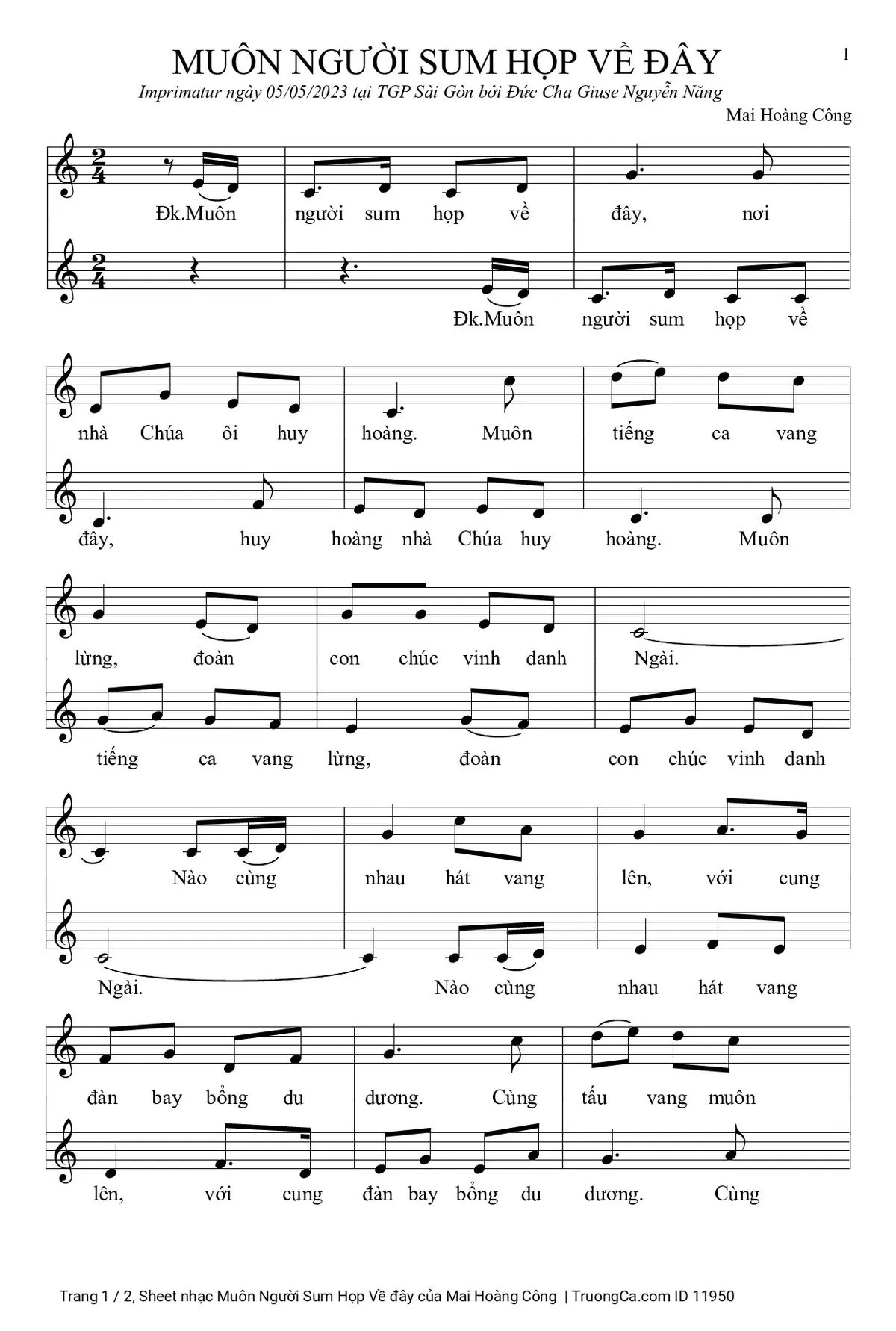 Điệp khúc. Muôn người sum họp về đây, nơi nhà Chúa ôi huy hoàng. Muôn tiếng ca vang lừng, đoàn con chúc vinh danh Ngài. Nào cùng nhau hát vang lên, với cung đàn bay bổng du dương. Cùng tấu vang muôn lời, ca ngợi Chúa Trời.