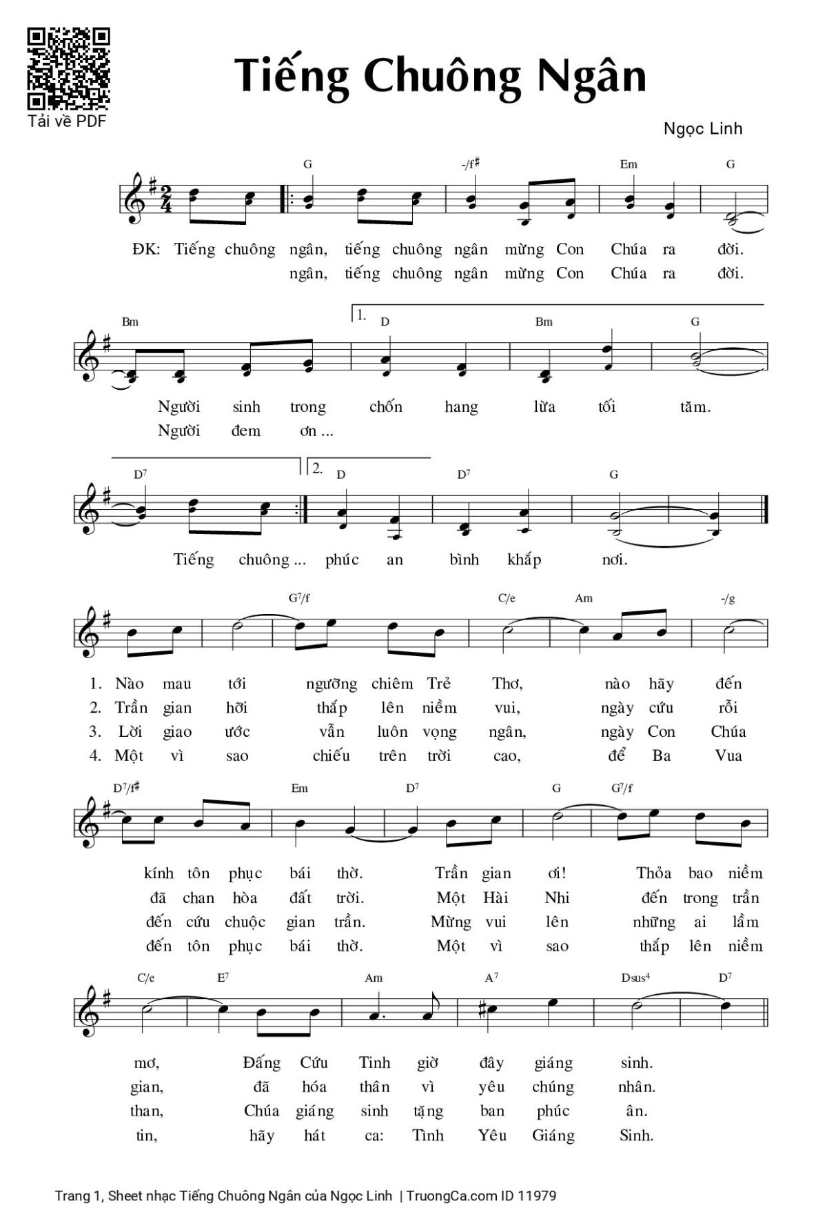 Điệp khúc: Tiếng chuông ngân, tiếng chuông ngân mừng Con Chúa ra đời. Người sinh trong chốn hang lừa tối tăm. Tiếng chuông ngân, tiếng chuông ngân mừng Con Chúa ra đời. Người đem ơn phúc an bình khắp nơi.