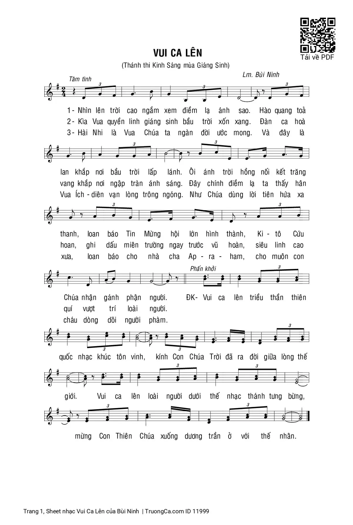 Vui ca lên triều thần thiên quốc nhạc khúc tôn vinh, kính Con Chúa Trời đã ra đời giữa lòng thế giới. Vui ca lên loài người dưới thế nhạc thánh tưng bừng, mừng Con Thiên Chúa xuống dương trần ở với thế nhân.