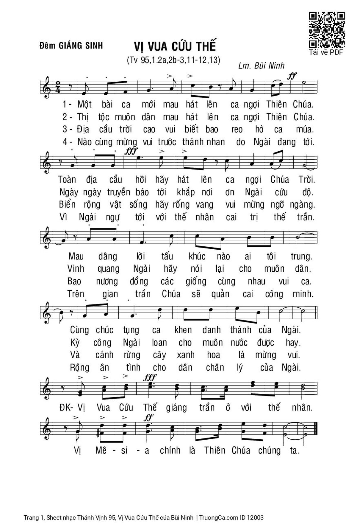 The Videos/audios Thánh Vịnh 95, Vị Vua Cứu Thế by Bùi Ninh were embed from Youtube, Musescore or the other 3rd links. Videos are subject to 3rd's copyright control and may be removed by YouTube's copyright rules and 3rd's policies or maybe included advertisements. If you cannot access to these songs, this mean that have been removed.