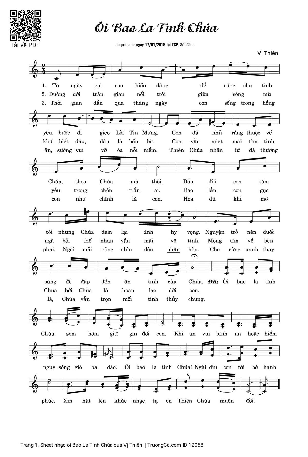 Điệp khúc. Ôi bao la tình Chúa! Sớm hôm giữ gìn đời con. Khi an vui bình an hoặc hiểm nguy sóng gió ba đào. Ôi bao la tình Chúa! Ngài dìu con tới bờ hạnh phúc. Xin hát lên khúc nhạc tạ ơn Thiên Chúa muôn đời.