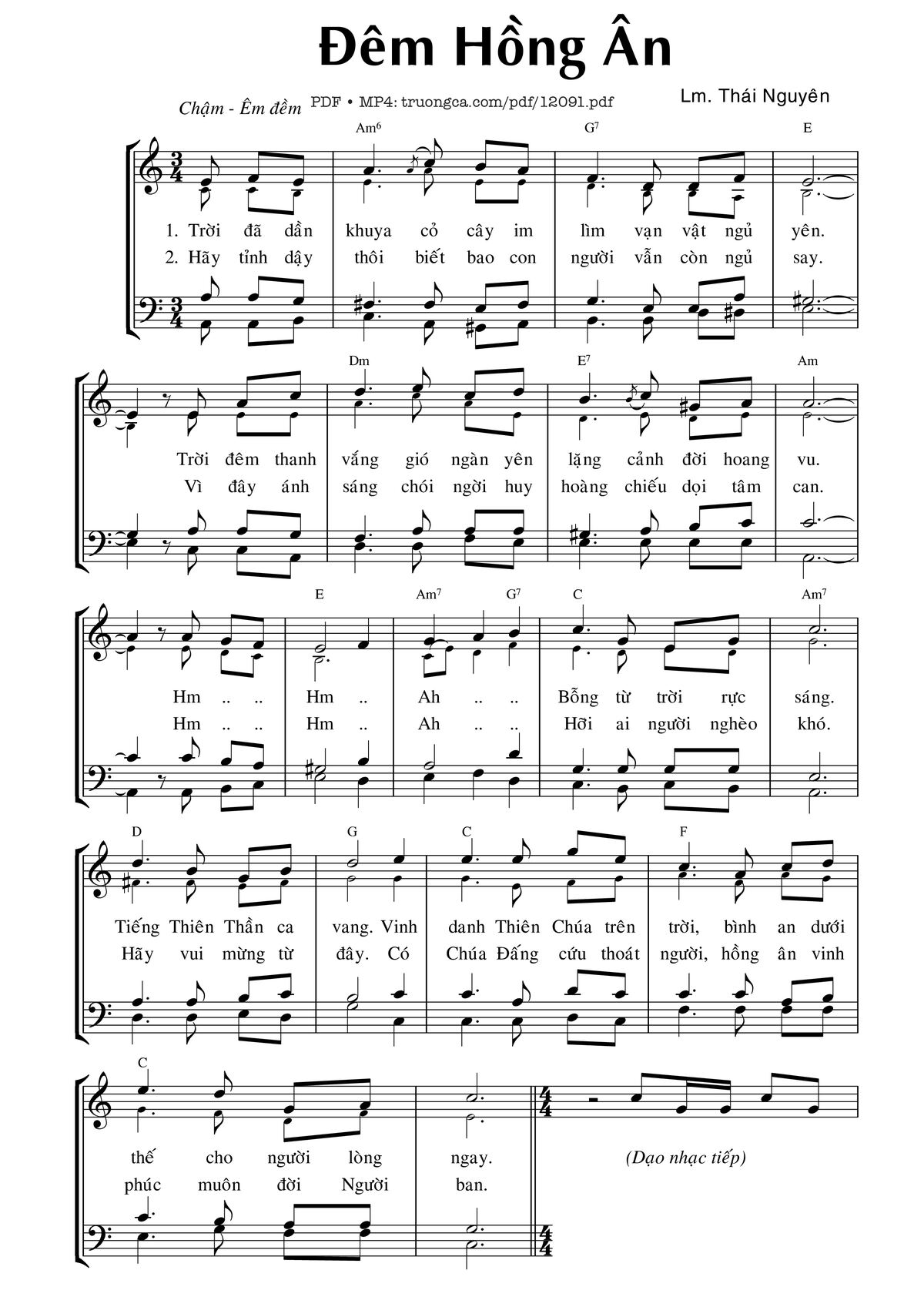 1. Trời đã dần khuya cỏ cây im lìm vạn vật ngủ yên. Trời đêm thanh vắng gió ngàn im lặng, cảnh đời hoang vu. Hm… Hm… Ah… Bồng từ trời rực sáng. Tiếng Thiên thần ca vang. Vinh danh Thiên Chúa trên trời, bình an dưới thế cho người lòng ngay (Dạo nhạc tiếp) … … Này người ơi! Chúa sinh ra đời, giữa trời giá đông. Này người ơi! nào mau đi tới, dâng lời hoan ca. (Nhạc dạo)