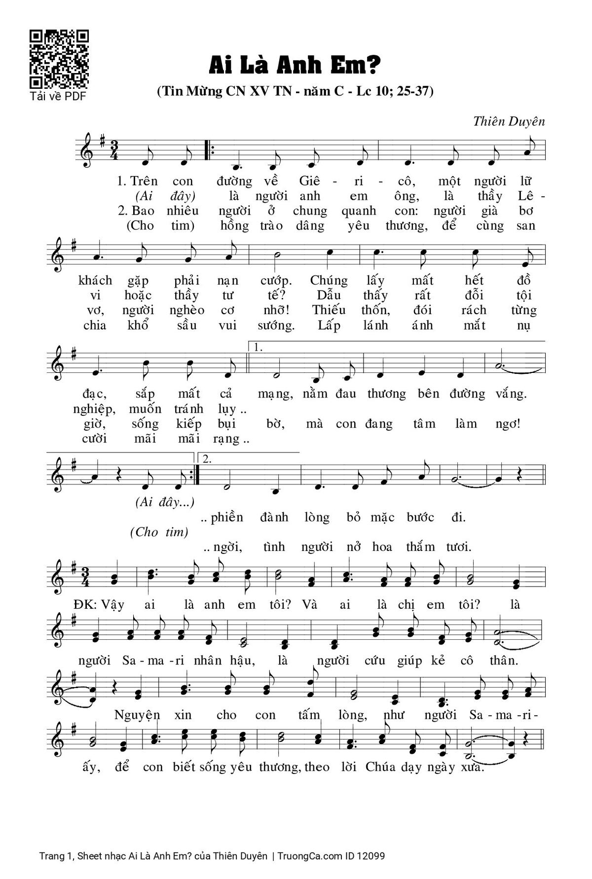 Điệp khúc. Vậy ai là anh em tôi? Và ai là chị em tôi? Là người Sa-ma-ri nhân hậu, là người cứu giúp kẻ cô thân. Nguyện xin cho con tấm lòng, như người Sa-ma-ri ấy, để con biết sống yêu thương, theo lời Chúa dạy ngày xưa.
