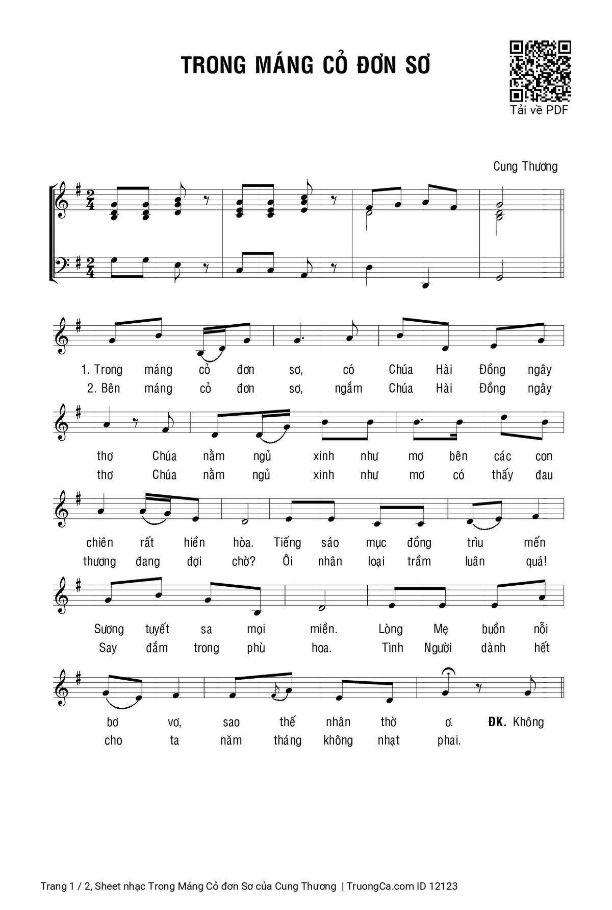 1. Trong máng cỏ đơn sơ có Chúa Hài Đồng ngây thơ. Chúa nằm ngủ xinh như mơ bên các con chiên rất hiền hòa. Tiếng sáo mục đồng trìu mến sương tuyết sa mọi miền. Lòng Mẹ buồn nỗi bơ vơ sao thế nhân thờ ơ?