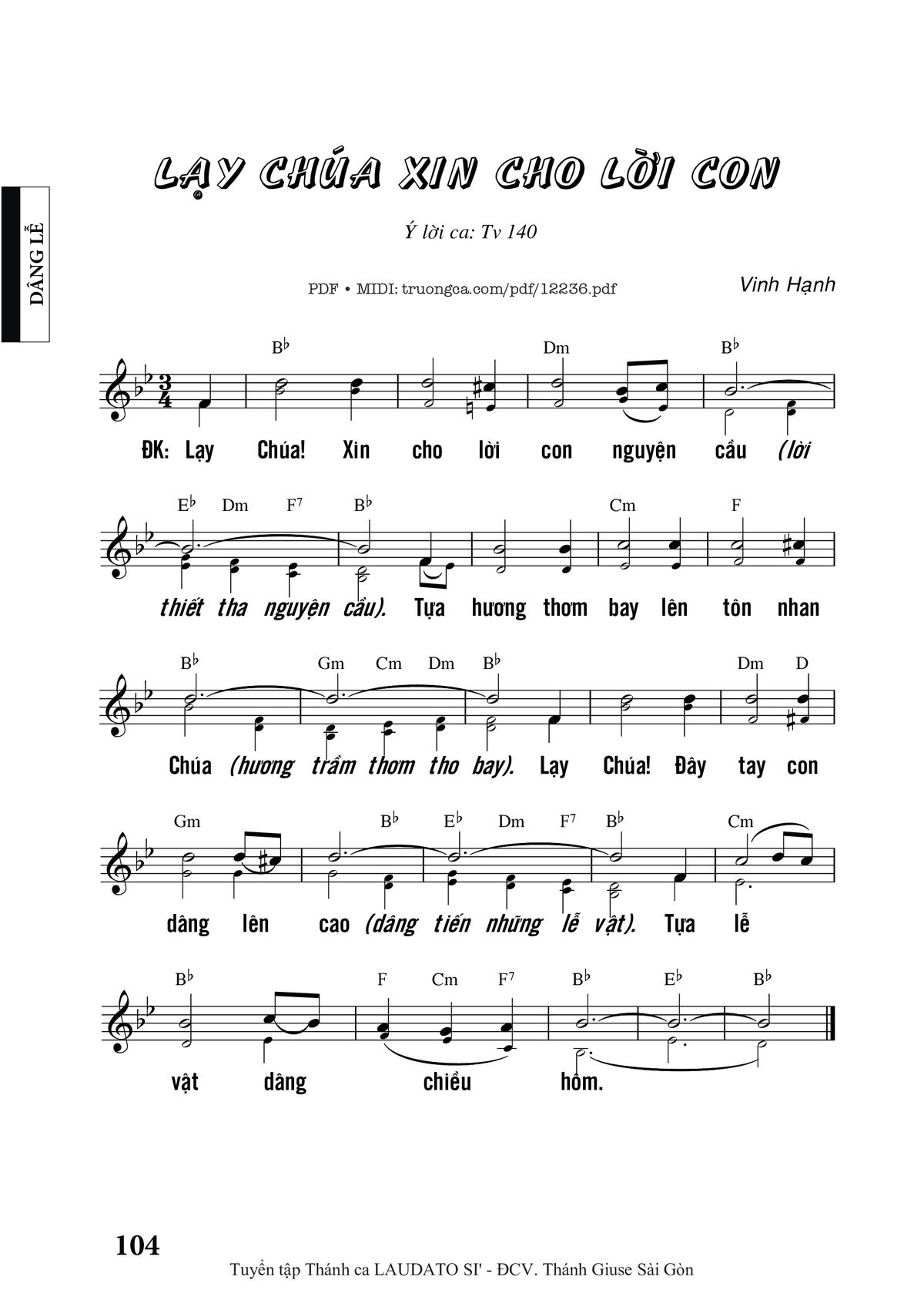 Điệp khúc. Lạy Chúa xin cho lời con nguyện cầu, tựa hương thơm bay lên tôn nhan Chúa. Lạy Chúa đây tay con dâng lên cao, tựa lễ vật dâng chiều hôm.
