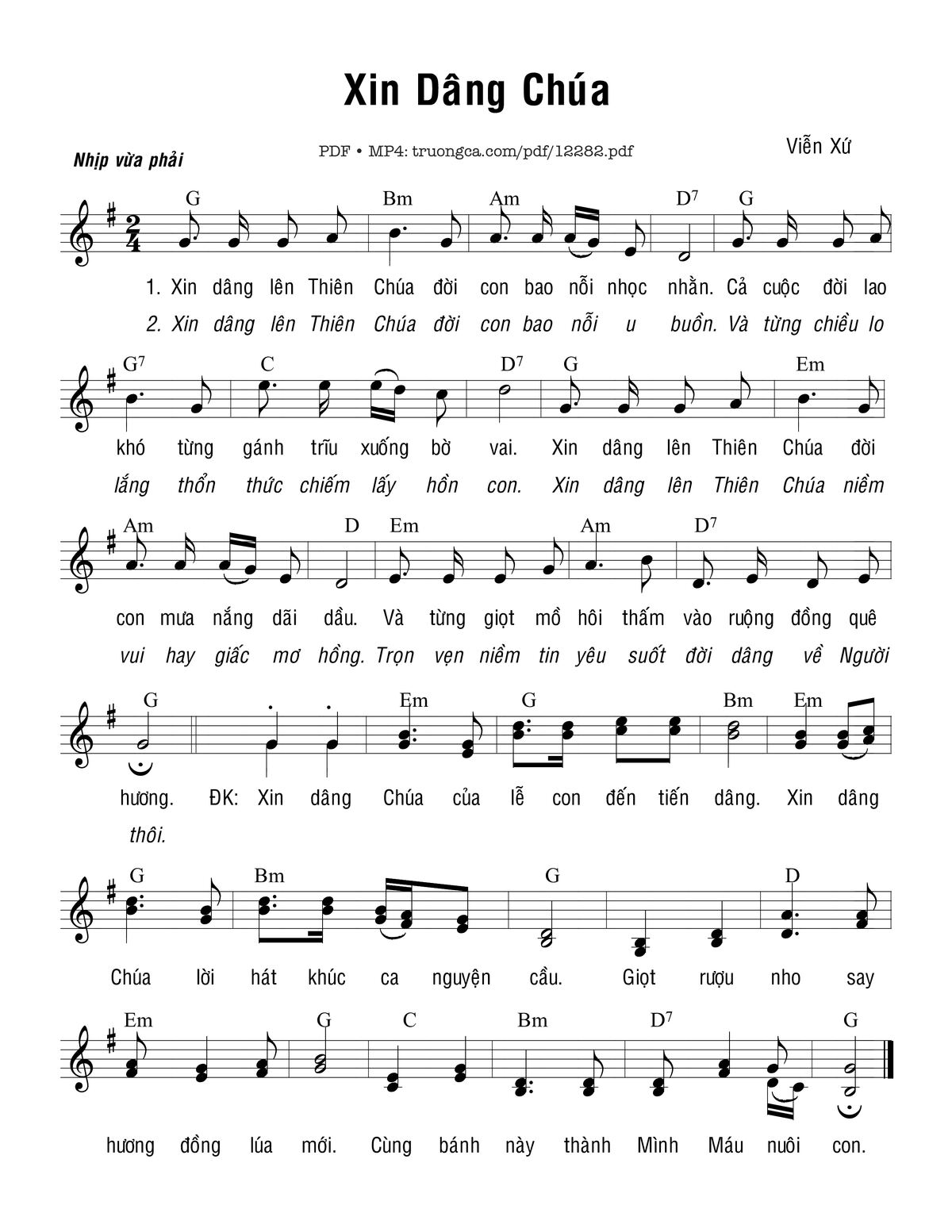 1. Xin dâng lên Thiên Chúa đời con bao nỗi nhọc nhằn . Cả cuộc đời lao khó từng gánh trĩu xuống bờ vai . Xin dâng lên Thiên Chúa đời con mưa nắng dãi dầu . Và từng giọt mồ hôi thấm vào ruộng đồng quê hương.