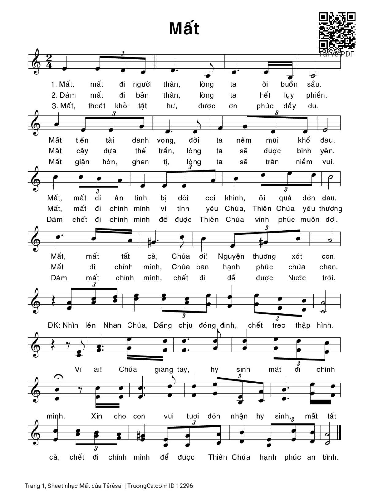 1. Mất, mất đi người thân, lòng ta ôi buồn sầu. mất tiền tài danh vọng, đời ta nếm mùi khổ đau. Mất, mất đi ân tình, bị đời coi khinh, ôi quá đớn đau. Mất, mất tất cả, Chúa ơi! Nguyện thương xót con.