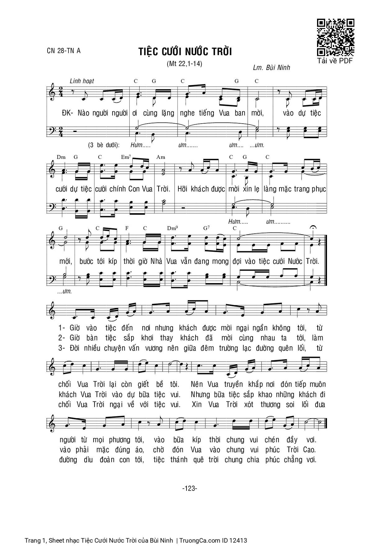 Điệp khúc. Nào người người ơi cùng lặng nghe tiếng Vua ban mời, vào dự tiệc cưới chính Con Vua Trời. Hỡi khách được mời xin lẹ làng mặc trang phục mới, bước tới kịp thời giờ Nhà Vua vẫn đang mong đợi vào tiệc cưới Nước Trời.