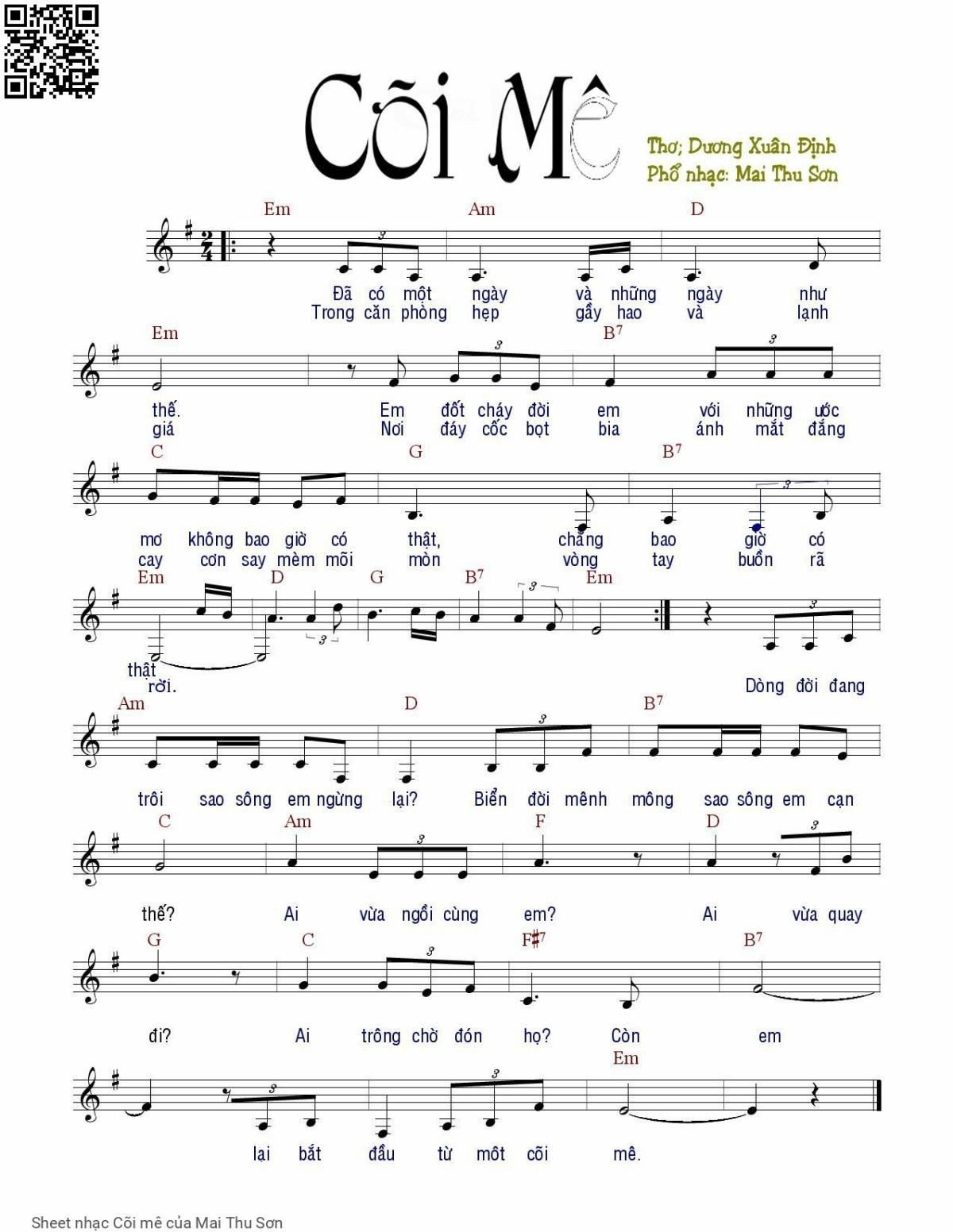Transposition is the process of moving a song's melody and chords up or down in pitch by a constant interval. The direction of the transposition tool is indicated by a plus (+) sign for up and a minus (-) sign for down. Hover mouse over chords signs to see the chords chart of Cõi mê song.