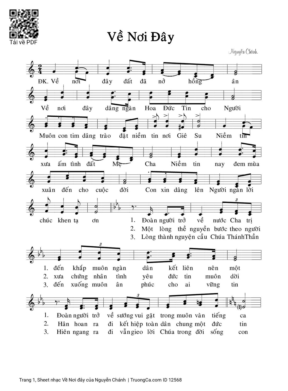 Transposition is the process of moving a song's melody and chords up or down in pitch by a constant interval. The direction of the transposition tool is indicated by a plus (+) sign for up and a minus (-) sign for down. Hover mouse over chords signs to see the chords chart of Về Nơi đây song.
