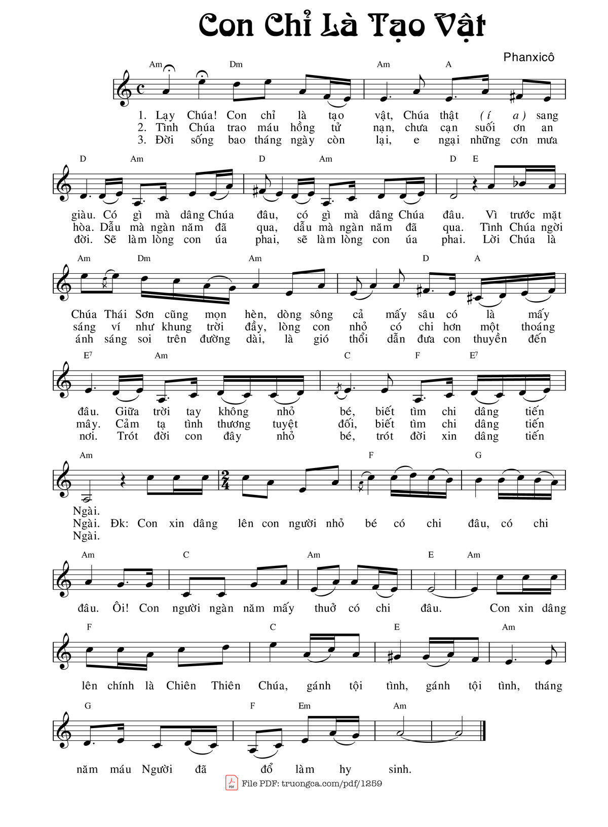 The Videos/audios Con chỉ là tạo vật by Phanxicô were embed from Youtube, Musescore or the other 3rd links. Videos are subject to 3rd's copyright control and may be removed by YouTube's copyright rules and 3rd's policies or maybe included advertisements. If you cannot access to these songs, this mean that have been removed.