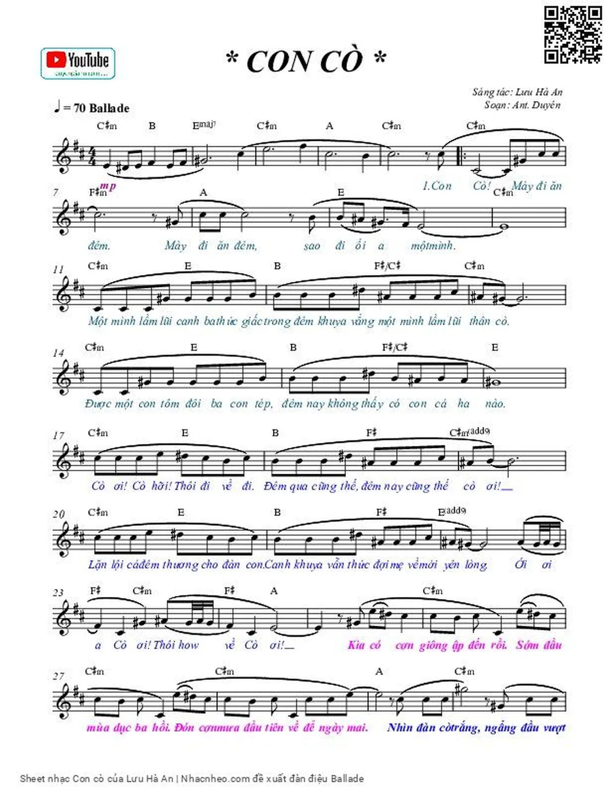 Lưu Hà An Con cò mày đi ăn đêm Mày đi ăn đêm [PDF] [Sheet] [Lyrics] [Mp4/Midi]