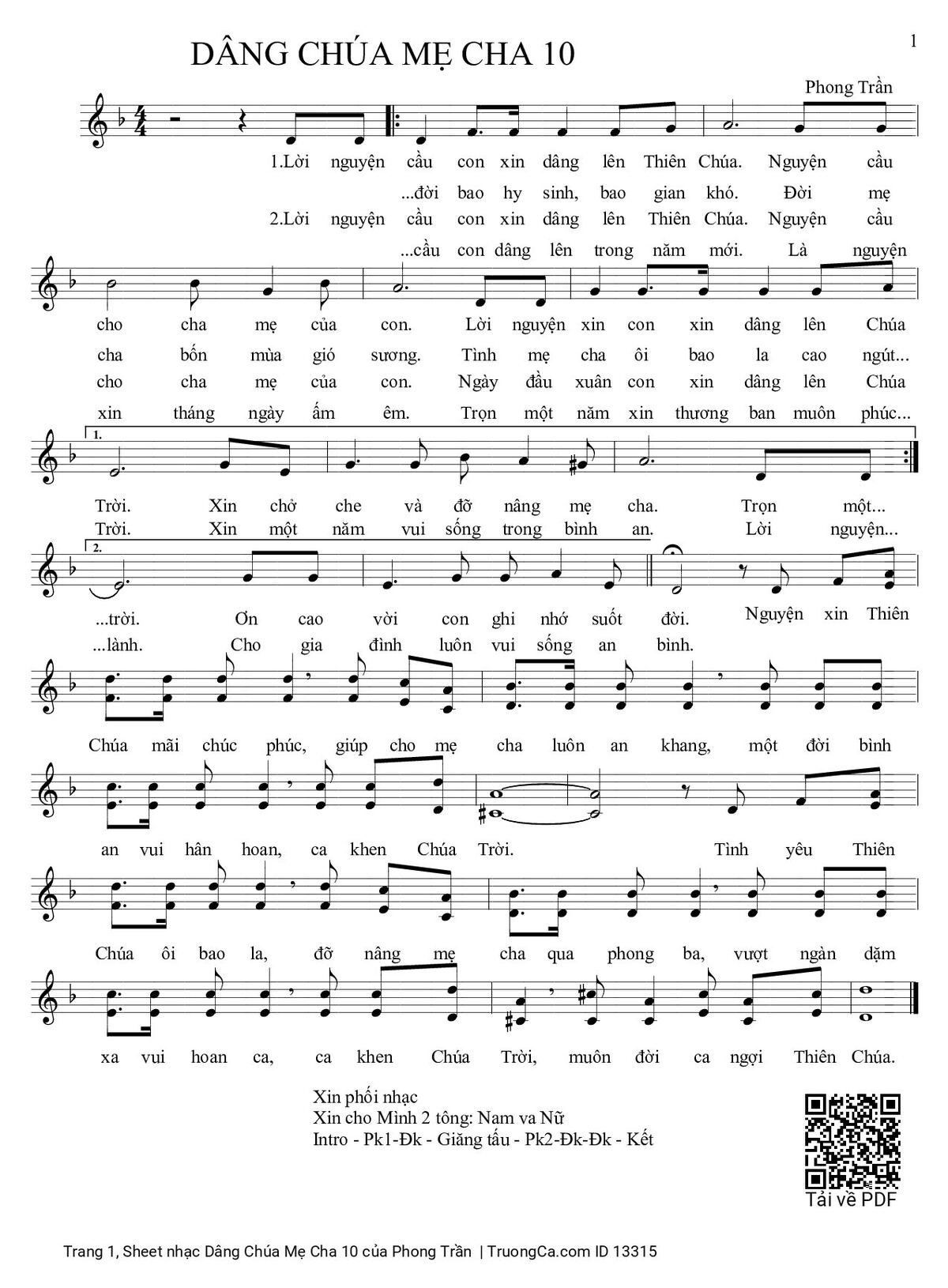Phong Trần Lời nguyện cầu con xin dâng lên Thiên Chúa [PDF] [Sheet] [Lyrics] [Mp4/Midi]