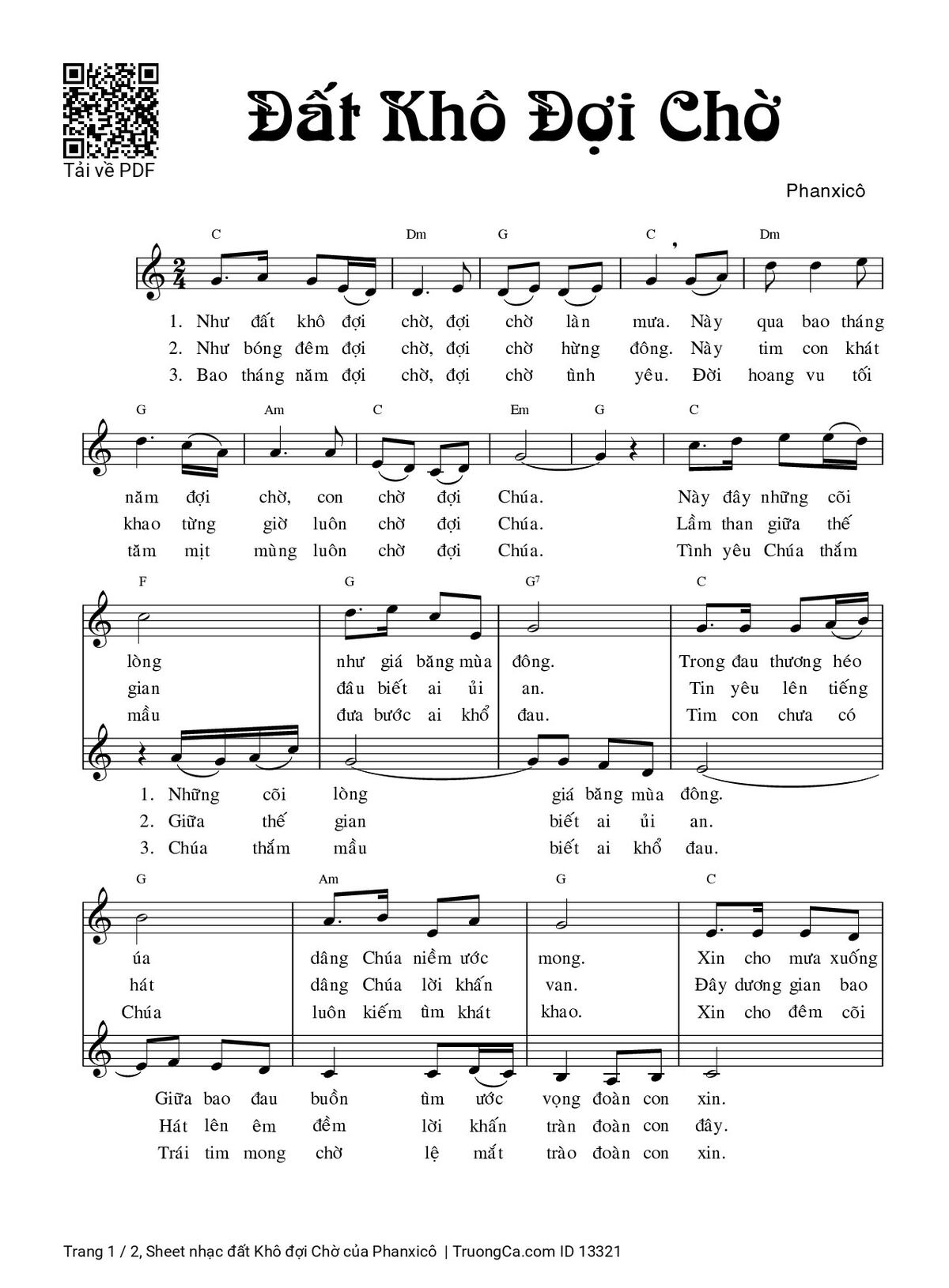 1. Như đất khô đợi chờ, đợi chờ làn mưa. Này qua bao tháng năm đợi chờ, con chờ đợi Chúa. Này đây những cõi lòng như giá băng mùa đông. Trong đau thương héo úa, dâng Chúa niềm ước mong. Xin cho mưa xuống đời, xin cho rơi làn sương. Đây bao tâm hồn chờ mong Chúa tình thương.