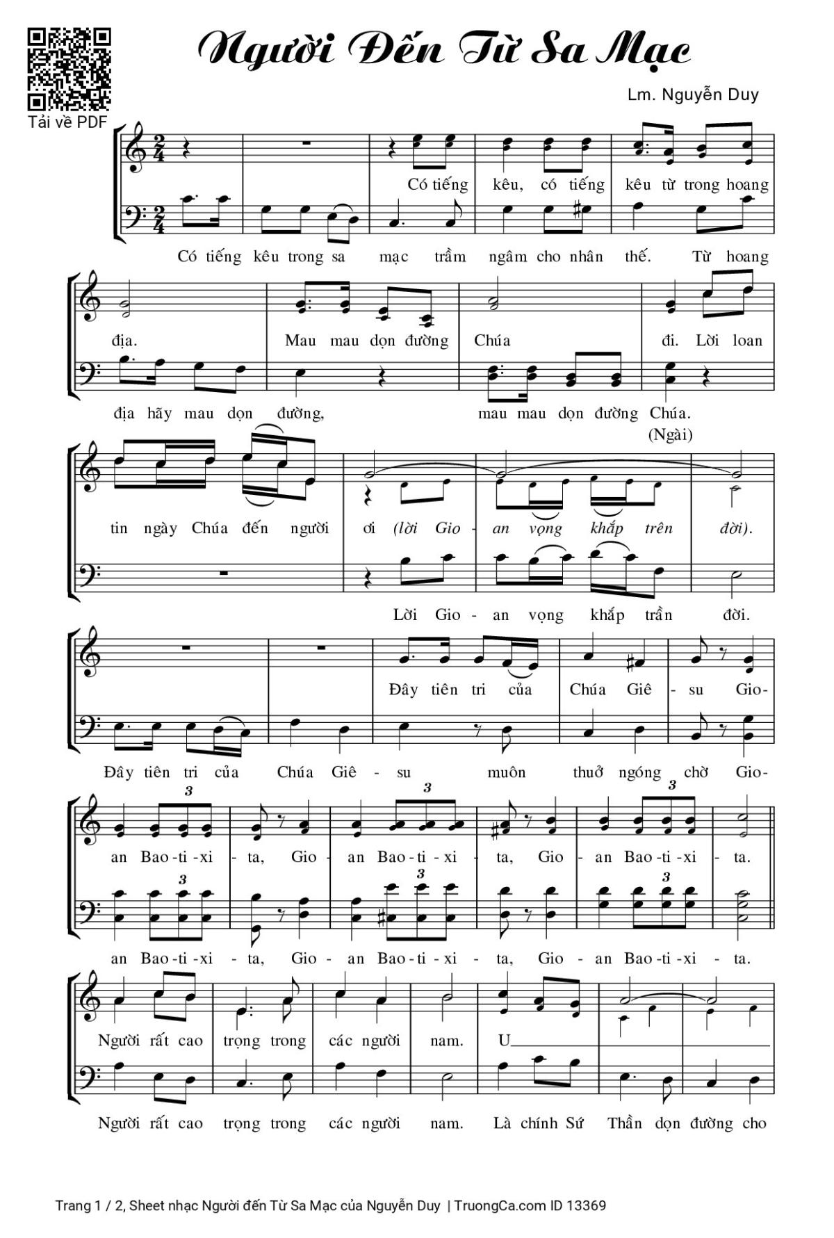 (Có tiếng kêu trong sa mạc trầm ngâm cho nhân thế ) Có tiếng kêu, có tiếng kêu từ trong hoang địa. (Từ hoang địa hãy mau dọn đường) Mau mau dọn đường Chúa đi (mau mau dọn đường Chúa) Lời loan tin ngày Chúa đến người ơi! (Lời Gioan vọng khắp trần đời)