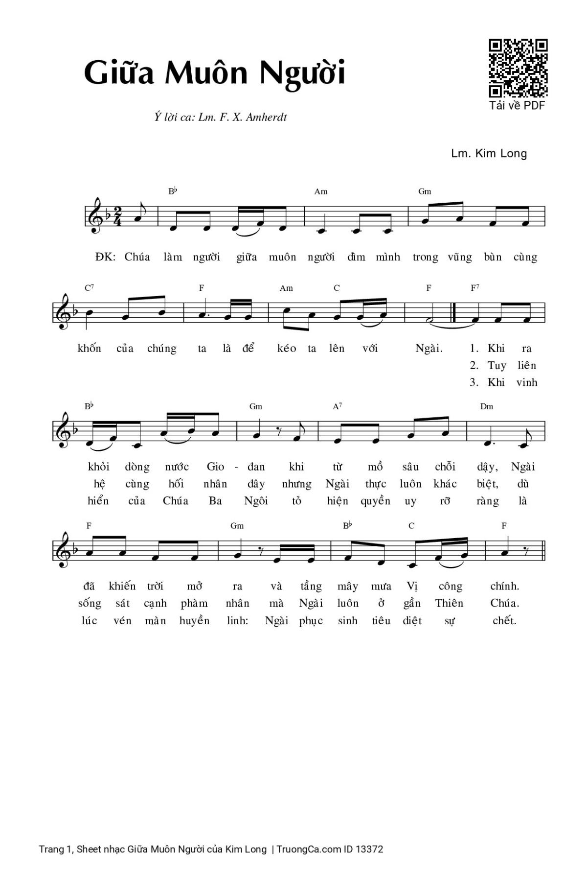 Transposition is the process of moving a song's melody and chords up or down in pitch by a constant interval. The direction of the transposition tool is indicated by a plus (+) sign for up and a minus (-) sign for down. Hover mouse over chords signs to see the chords chart of Giữa Muôn Người song.