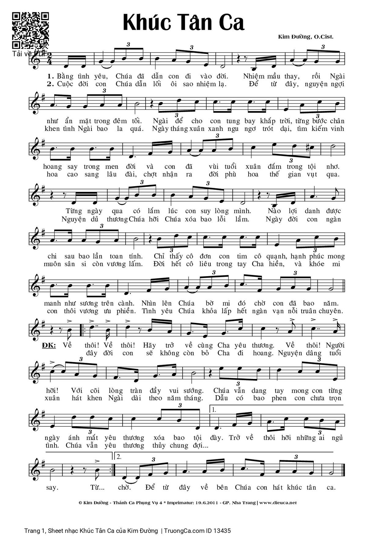 Điệp khúc. Về thôi! Về thôi! Hãy trở về cùng Cha yêu thương. Về thôi! Người hỡi! Với cõi lòng tràn đầy vui sướng. Chúa vẫn dang tay mong con từng ngày ánh mắt yêu thương xóa bao tội đày. Trở về thôi hỡi những ai ngủ say. Từ đây đời con sẽ không còn bỏ Cha đi hoang. Nguyện dâng tuổi xuân hát khen Ngài dài theo năm tháng. Dẫu có bao phen con chưa trọn tình. Chúa vẫn yêu thương thủy chung đợi chờ. Để từ đây về bên Chúa con hát khúc tân ca.