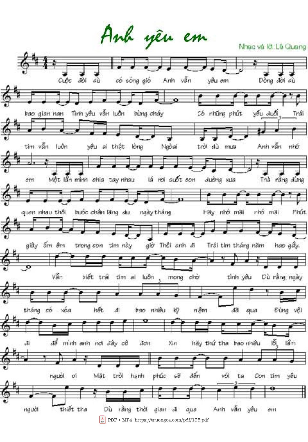 The Videos/audios Anh yêu em by Lê Quang were embed from Youtube, Musescore or the other 3rd links. Videos are subject to 3rd's copyright control and may be removed by YouTube's copyright rules and 3rd's policies or maybe included advertisements. If you cannot access to these songs, this mean that have been removed.