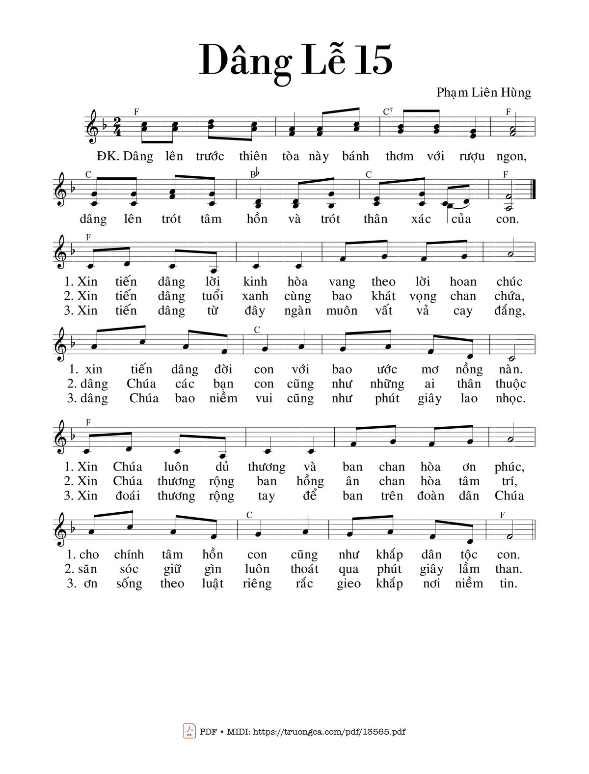 Transposition is the process of moving a song's melody and chords up or down in pitch by a constant interval. The direction of the transposition tool is indicated by a plus (+) sign for up and a minus (-) sign for down. Hover mouse over chords signs to see the chords chart of Dâng Lễ 15 song.